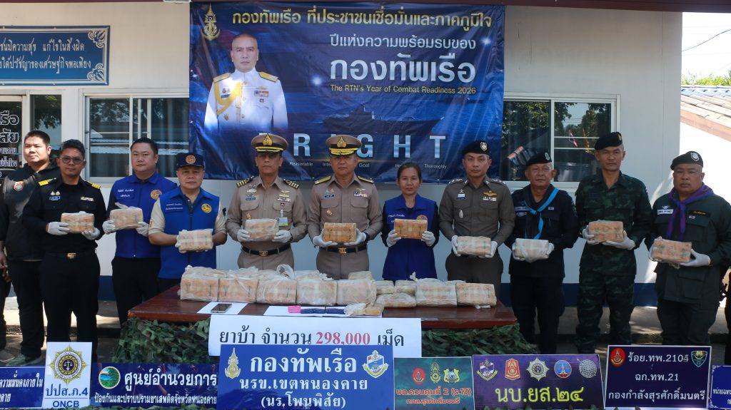 วันที่ 28 ตุลาคม 2568 ที่ หน่วยเรือโพนพิสัย หน่วยเรือรักษาความสงบเรียบร้อยตามลำแม่น้ำโขง เขตหนองคาย พล.ร.ต.ณรงค์ เอมดี ผบ.นรข.,นาวาเอก วิศิษฐ์พงศ์ เจริญวิชยเดช ผู้บังคับหน่วยเรือรักษาความสงบเรียบร้อยตามลำแม่น้ำโขง เขตหนองคาย ,ร.อ.ภาสพล สีทองเกตุ หน.หน่วนเรือโพนพิสัย,นายเดชมนตรี ผิวเหลือง ป้องกันจังหวัดหนองคาย,พ.ต.อ.สุรกิจ ค้วนเครือ ผกก.สภ.โพนพิสัย,ฝ่ายปกครองอำเภอโพนพิสัย ,ร้อย ฉก.ทพ 2105 ,ร.ต.ไชโย หรพูน บกควบคุมที่ 2 กกล.สุรศักดิ์มนตรี และหน่วยงานที่เกี่ยวข้อง ร่วมกันแถลงผลการตรวจยึดยาบ้า จำนวน 298,000 เม็ด ได้ที่บริเวณเขื่อนป้องกันตลิ่งริมฝั่งแม่น้ำโขง หน้าสถานีโรงไฟฟ้าย่อย บ.แดนเมือง ต.วัดหลวง อ.โพนพิสัย จว.หนองคาย