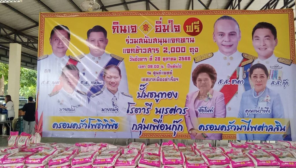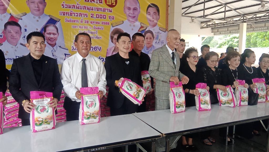 วันที่ 28 ตุลาคม 2568 ที่ศูนย์แพทย์เฉลิมพระเกียรติ 80 พรรษาเทศบาลเมืองท่าเรือพระแท่น ตำบลท่าเรือ อำเภอท่ามะกา จังหวัดกาญจนบุรี นายชาดา ไทยเศรษฐ์ อดีตรัฐมนตรีช่วยว่าการกระทรวงมหาดไทยและเป็นประธานวิปรัฐบาล นายยศวัฒน์ มาไพศาลสิน หรือ ส.ส.กุ๊ก สมาชิกสภาผู้แทนราษฎรจังหวัดกาญจนบุรี เขต 3 พรรคภูมิใจไทย นายปารเมศ โพธารากุล หรือกำนันบอย นายชูเกียรติ จีนาภักดิ์ เลขานุการคณะกรรมาธิการการกีฬา สภาผู้แทนราษฎร นายสันติ กิตติโชติทรัพย์ นายกเทศมนตรีเทศบาลเมืองท่าเรือพระแท่น นางสาวปุณยวีร์ โพธิพิพิธ ที่ปรึกษานายกเทศมนตรีเทศบาลเมืองท่าเรือพระแท่น นายอธิสรรค์ อินทร์ตรา ผู้ว่าราชการจังหวัดกาญจนบุรี นายฑรัท เหลืองสอาด ปลัดจังหวัดกาญจนบุรี ตัวแทนนางผกาวรรณ ศรีพุทธานุสรณ์ หรือซ้อไนท์ นายเสถียร มาเจริญรุ่งเรือง ประธานสภาเกษตรกรจังหวัดกาญจนบุรี และคณะ ได้ร่วมกันแจกข้าวสารแก่ประชาชนสองพันกว่าคน