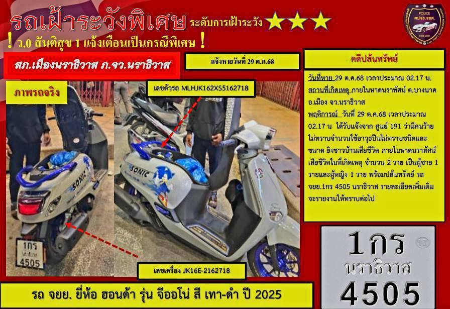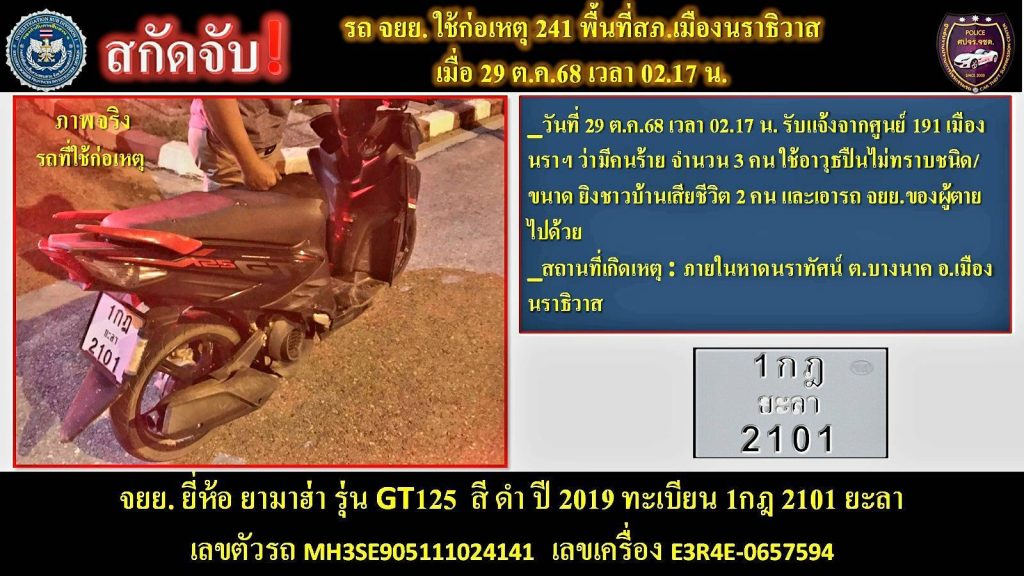 เวลาประมาณ 02.17 น.วันนี้ (29 ต.ค.68) รับแจ้งจาก ศูนย์ 191 ว่า เกิดเหตุคนร้ายประมาณ 3 คน ใช้อาวุธปืนพกสั้นไม่ทราบขนาด ยิงชายหญิงคู่หนึ่ง เสียชีวิตบริเวณสวนสน หาดนราทัศน์ เขตเทศบาลเมืองนราธิวาส หลังก่อเหตุเสร็จ คนร้ายยังนำรถ จยย.ของผู้ตายไปด้วย ส่วนรถคนร้ายเป็นรถ จยย.ยี่ห้อยามาฮ่า รุ่น GT125 สีดำ ทะเบียน 1กฎ 2101 ยะลา
