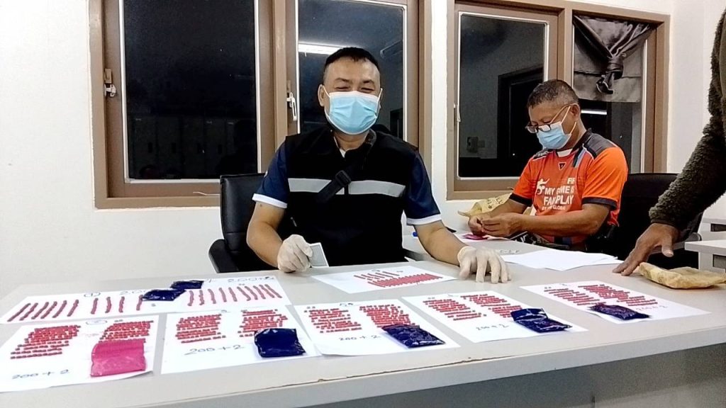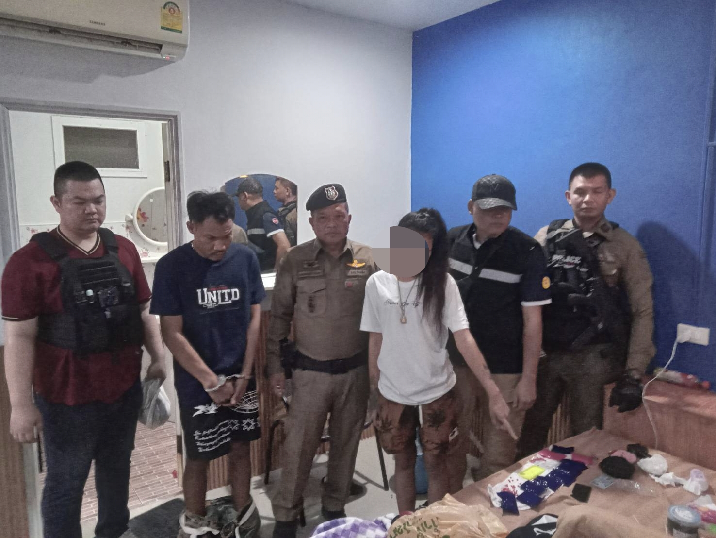 *** ซึ่งบุคคลที่อยู่ในห้องได้ให้เข้าตรวจสอบได้ โดยสองคนประกอบด้วย นายชาญชัย หรือระ ศาลางาม อายุ 27 ปี อยู่บ้านเลขที่ 334 หมู่ที่ 11 ต.ชุมพลบุรี อ.ชุมพลบุรี จ.สุรินทร์ และน.ส.อารยา หรือมิ้นท์ แสงภักดี อายุ 19 ปี อยู่บ้านเลขที่ 44 หมู่ที่ 11 ต.ราษฎร์พัฒนา อ.พยัคฆภูมิพิสัย จ.มหาสารคาม ในเบื้องต้นจากการตรวจสอบภายในห้องพบว่าใต้ที่นอนมียาบ้าทุกซ่อนอยู่และบนหลังแผงคอยล์เย็นแอร์จำนวน 8 มัด นอกจากนั้นยังพบยาบ้าอยู่ใต้เบาะรถจักรยานยนต์ honda รุ่น wave i สีแดงทะเบียน 2 กจ 3968 มหาสารคาม 2 มัด เป็นยาบ้าชนิดเม็ดสีส้ม ปั้มตัวอักษร WY รวมยาบ้าทั้งหมด 1,951 เม็ด ซึ่งทั้งสองให้การรับสารภาพว่าได้ตระเวนพากันไปเช่ารีสอร์ทนอนตามที่ต่างๆในเขตรอยต่อ จ.ร้อยเอ็ด – สุรินทร์ –มหาสารคาม ก่อนที่จะแจ้งให้ลูกค้ามารับโดยจะเปลี่ยนที่พักไปเรื่อยๆ กินควบคุมตัวส่งให้พนักงานสอบสวนดำเนินคดีในข้อหาร่วมกันจำหน่ายยาเสพติดประเภทที่ 1เมทแอมเฟตามีน (ยาบ้า)และมีไว้ในครอบครองโดยไม่ได้รับอนุญาต