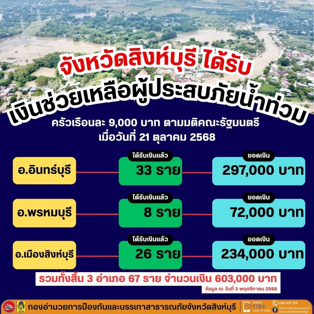 นายอำเภอพรหมบุรี มอบเงินเยียวยาน้ำท่วมจำนวน 9000 บาทให้กับผู้ประสบอุทกภัยอำเภอพรหมบุรี ซึีงประชาชนผู้ได้รับผลกระทบจากอุทกภัยที่ได้รับเงินเยียวยาเพื่อช่วยเหลือผู้ประสบอุทกภัยในช่วงฤดูฝน ปี 2568 ตามมติ ครม. เมื่อวันที่ 21 ตุลาคม 2568 ซึ่งได้รับโอนเงินเข้าบัญชีครัวเรือนละ 9,000 บาท ในวันที่ 3 พฤศจิกายน 2568 (ครั้งที่ 1) มีผู้ได้รับเงินแล้วจำนวน 67 ครัวเรือน เป็นจำนวนเงิน 603,000 บาท ดังนี้