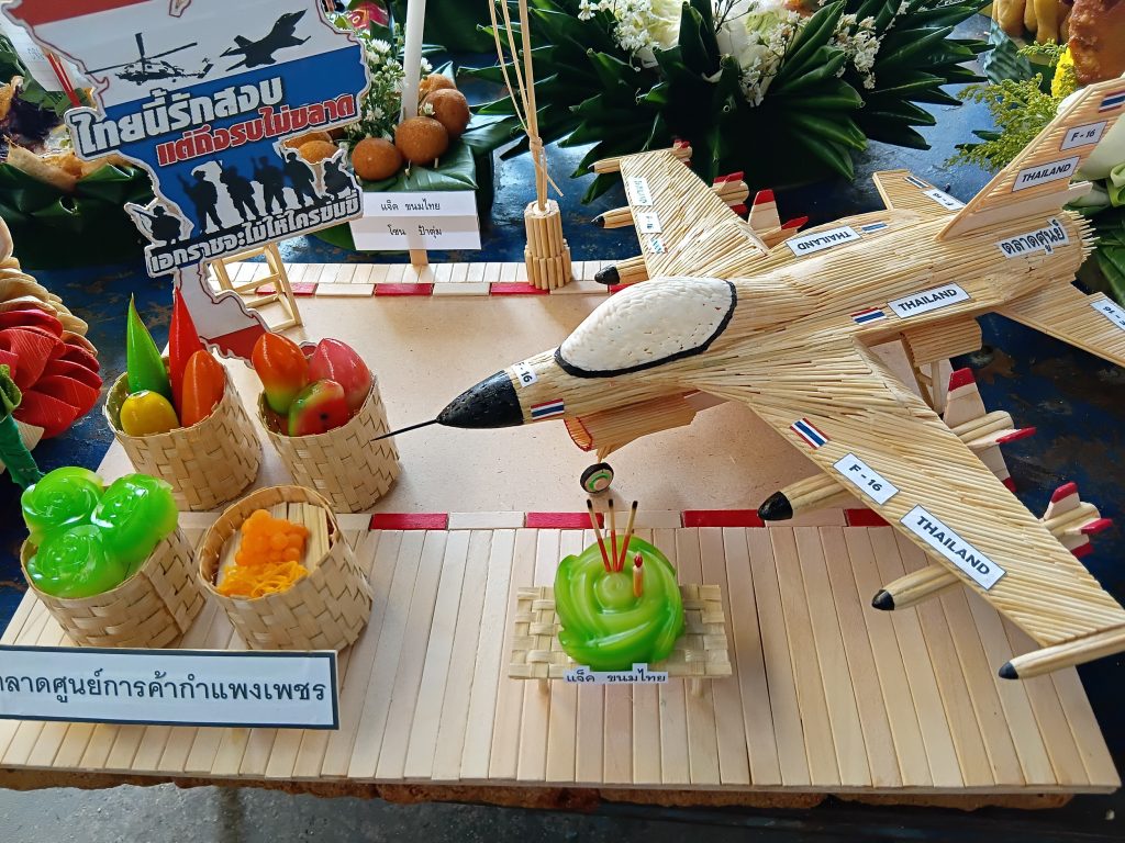 นายวิทวัส ชูจันทร์ เจ้าของกระทงเอฟ 16 เปิดเผยว่า เนื่องจากตนเคยเป็นทหารมาก่อนและรักเครื่องบินเอฟ 16 อย่างมาก เนื่องจากมีประสิทธิภาพสูงในการสู้รบ ประกอบกับช่วงนี้ชายแดนไม่สงบ ถ้าฝ้ายตรงข้ามได้ยินเสียงเอฟ 16 ก็หนาวแล้ว โดยใช้เวลาในการทำ 1 เดือน วัตถุดิบที่ใช้มีไม้จิ้มฟัน ไม้ไอติมเมล็ดข้าวสารและกาวร้อนค่อยๆประกอบไปเรื่อย สาเหตุที่ใช้รูปเครื่องบินเอ็ม 16 เพราะความรักชาติ