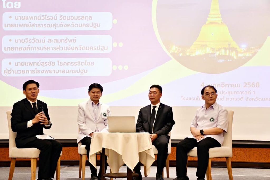 วันที่ 4 พฤศจิกายน 2568 เวลา 09.00 น. นายแพทย์ทวีศิลป์ วิษณุโยธิน ที่ปรึกษารัฐมนตรีว่าการกระทรวงสาธารณสุขและที่ปรึกษากรมการแพทย์ เป็นประธานเปิด การประชุมถ่ายทอดองค์ความรู้ แนวทางปฏิบัติ เครื่องมือ/คู่มือ ของระบบสุขภาพชุมชนสู่ระบบบริการสุขภาพ ฯ DMS Model ใน 3 จังหวัดพื้นที่เป้าหมาย โดยได้รับเกียรติจาก นายปรีชา ดิลกพรเมธี รองผู้ว่าราชการจังหวัดนครปฐม กล่าวต้อนรับ และ รศ.(พิเศษ) นายแพทย์สถิตย์ นิรมิตรมหาปัญญา ผู้อำนวยการสถาบันวิจัยและประเมินเทคโนโลยีทางการแพทย์ กล่าวรายงาน พร้อมด้วย นายแพทย์สาธารณสุขจังหวัดนครปฐม คณะผู้บริหาร จังหวัดนครปฐม เข้าร่วมพิธี และภายในงาน มีการ เสวนาในประเด็นปัญหาสุขภาพผู้สูงอายุจังหวัดนครปฐม จากมุมมองของผู้บริหาร โดยผู้ร่วมเสวนา ประกอบด้วย นายแพทย์วิโรจน์ รัตนอมรสกุล นายแพทย์สาธารณสุขจังหวัดนครปฐม นายจิรวัฒน์ สะสมทรัพย์ นายกองค์การบริหารส่วนจังหวัดนครปฐม และนายแพทย์สุรชัย โชคครรชิตไชย ผู้อำนวยการโรงพยาบาลนครปฐม ณ ห้องประชุมทวราวดี 1 ชั้น 2 โรงแรมไมด้า แกรนด์ ทวารวดี จังหวัดนคปฐม