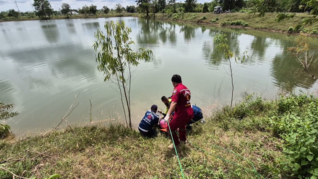 หนุ่มใหญ่ใส่หมวกกันน็อคไปช่วยญาติเกี่ยวข้าวเกิดอาการวูบพลัดตกลงไปจมน้ำในสระเสียชีวิต