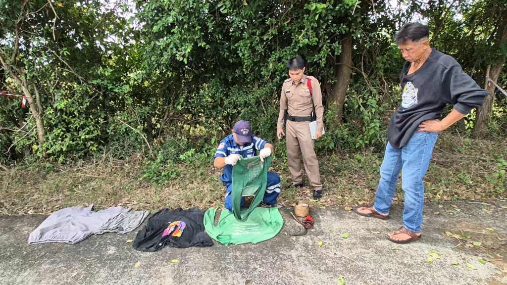 ที่เกิดเป็นสระน้ำมีพื้นที่จำนวน 20 ไร่ ลึกประมาณ 5-6 เมตร พบร่างของชายฃสวมหมวกกันน็อต สีชมพู สวมเสื้อคลุมแขนยาว สีน้ำเงิน ทับเสื้อยืดน้ำเงินแขนสั้น นุ่งกางเกงขายาวสีน้ำตาล ใส่รองเท้าบูทสีดืจมอยู่ในสระ ห่างจากจุดที่จมไป 10 เมตร พบรถจยย.ฮอนด้าเวฟสีแดงดำ ทะเบียน ขขง 838 พัทลุง ล้มพลิกคว่ำอยู่ข้างรั้วติดกับทุ่งนาของชาวบ้าน ห่างไปอีก 5 เมตร พบถุงย่ามสีเขียว ข้างในมีกระติกข้าวพร้อมกับแกง 1 ถุง, เคียวเกี่ยวข้าว 1อัน, ไฟสายส่องกบ 1 อัน ถุงยา1 ถุง ,มีดโกน 1 ด้าม, เสื้อ2 ตัว และ กางเกง 2 ตัว