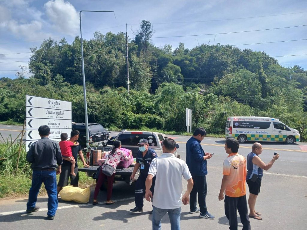 ที่เกิดเหตุพบรถยนต์กระบะ 4 ประตู Isuzu สีเทา ทะเบียน น่าน พลิกตะแคงอยู่ในร่องน้ำ มี นายมงคล (สมมุติสงวนนามสกุล) อายุ 44 ปี ที่อยู่ อ.หาดใหญ่ จ.สงขลา เป็นคนขับ โดยมีผู้ร่วมเดินทางบาดเจ็บรวม 9 ราย