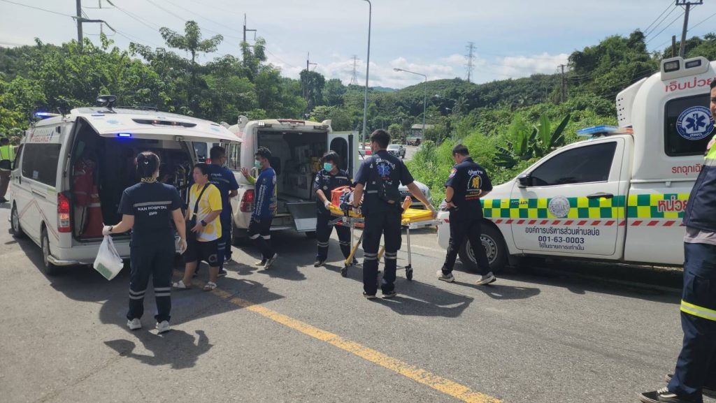 หน่วยกู้ชีพร่วมช่วยเหลือในจุดเกิดเหตุ ได้แก่ กู้ชีพ อบต.บ่อ, กู้ชีพ อบต.ผาสิงห์, กู้ชีพสว่างนครน่านรวมใจ, กู้ชีพ อบจ.น่าน, กู้ภัยน่าน, และกู้ภัยเพชรเกษม เขตเมือง รถกู้ชีพศูนย์นเรนทรน่าน ก่อนนำผู้ได้รับบาดเจ็บส่งโรงพยาบาลน่านเพื่อรักษาต่อไป