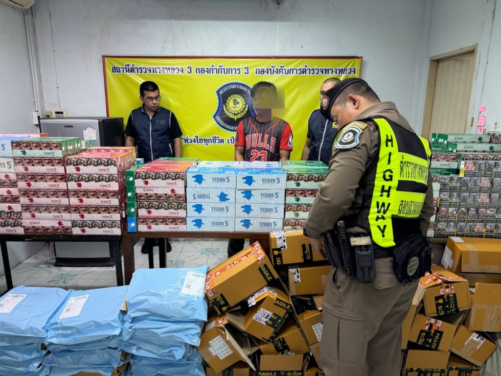 เมื่อวันที่6พ.ย.68 เวลา18.00น.ขณะที่พ.ต.ต.ก่อเกียรติ เกียรติตั้ง สว.ส.ทล.3 กก.3 บก.ทล ตำรวจทางหลวงระยอง ได้รับแจ้งจากสายลับว่าจะมีรถกระบะทึบโตโยต้า รีโว่ป้ายแดง ทะเบียน ชลบุรี บรรทุกบุหรี่ ต่างประเทศและในประเทศ จากประเทศเพื่อนบ้าน จึงพร้อมด้วย ร.ต.อ.ประพันธ์ เอี่ยมประโคน, ร.ต.อ.วิรัตน์ สุขเสริฐ บก.ทล., ร.ต.ต.เอกอนันต์ เนตรวิศิษย์, รอง สว.ส.ทล.3 กก.3 บก.ทล. ด.ต.รัชเดช แอมนนท์, ด.ต.มัชฌิมา ศักดาเพชรศิริ, ด.ต.อนุรักษ์ โพธิ์ประดิษฐ์, ด.ต.ธนากร บรรเทาทุกข์, ด.ต.สันติชัย ดวงสี่มณี, ด.ต.สุรศักดิ์ ศิริชาติ ผบ.หมู่ ส.ทล.3 กก.3 บก.ทล.ออกตรวจติดตามรถดังกล่าวที่ถนนสุขุมวิท ขาเข้าระยอง กม.228-229 พบรถคันดังกล่าวจึงเรียกจอดพร้อมเปิดประตูทึบด้านหลังพบบุหรี่ต่างประเทศ 6,680 ซอง บุหรี่ภายในประเทศ 650 ซอง รวมจำนวนบุหรี่ของกลาง