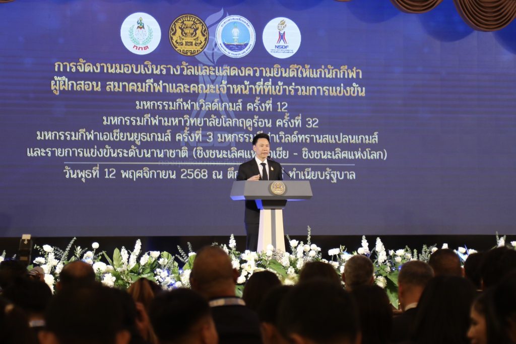 นายอรรถกร ศิริลัทธยากร รัฐมนตรีว่าการกระทรวงการท่องเที่ยวและกีฬา เป็นประธานในพิธีมอบเงินรางวัลและแสดงความยินดีกับ นักกีฬา ผู้ฝึกสอน สมาคมกีฬา และคณะเจ้าหน้าที่ที่เข้าร่วมการแข่งขันมหกรรมกีฬาเวิลด์เกมส์ ครั้งที่ 12, มหกรรมกีฬามหาวิทยาลัยโลกฤดูร้อน ครั้งที่ 32, มหกรรมกีฬาเอเชียนยูธเกมส์ ครั้งที่ 3 และ มหกรรมกีฬาเวิลด์ทรานสแปลนเกมส์ โดยมี นางสาวนัทรียา ทวีวงศ์ ปลัดกระทรวงการท่องเที่ยวและกีฬา, ดร.ก้องศักด ยอดมณี ผู้ว่าการการกีฬาแห่งประเทศไทย (กกท.), คณะกรรมการการกีฬาแห่งประเทศไทย, คณะกรรมการบริหารกองทุนพัฒนาการกีฬาแห่งชาติ และคณะผู้บริหาร กกท. เข้าร่วมงาน ณ ตึกสันติไมตรี ทำเนียบรัฐบาล เมื่อวันที่ 12 พฤศจิกายน 2568 ที่ผ่านมา