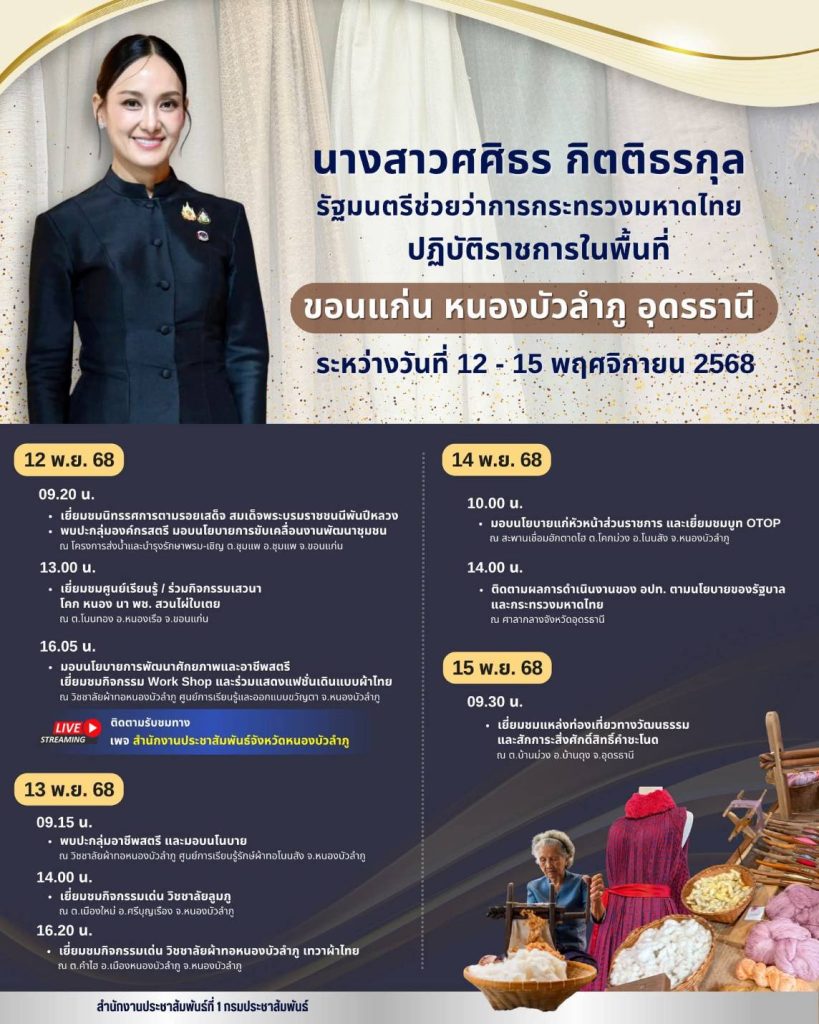 เมื่อวันที่ ๑๓ พฤศจิกายน ๒๕๖๘ เวลา ๐๖.๔๐ น. ณ ศาลากาเปรียญวัดป่าภูกระแต ตำบลหนองบัว อำเภอเมืองหนองบัวลำภู จังหวัดหนองบัวลำภู นางสาวศศิธร กิตติธรกุล รัฐมนตรีช่วยว่าการกระทรวงมหาดไทย พร้อม นายสุรศักดิ์ อักษรกุล ผู้ว่าราชการจังหวัดหนองบัวลำภู อดีตอธิบดีกรมการพัฒนาชุมชน นำคณะผู้บริหาร อาทิ นายศศิน พัฒนภิรมย์ และ นางสาวอรอาภา โล่ห์วีระ รองผู้ว่าราชการจังหวัดหนองบัวลำภู หัวหน้าส่วนราชการ นายประมง ทัศดร คหบดี และประชาชนในพื้นที่จังหวัดหนองบัวลำภู ร่วมทำบุญตักบาตรหลวงพ่อทองพูน กาญจโน เจ้าอาวาสวัดป่าภูกระแต พระวุฒิสารโสภณ เจ้าคณะจังหวัดหนองบัวลำภู(ธ)พระภิกษุสงฆ์และสามเณร จำนวน ๓๓ รูป ด้วยบรรยากาศเป็นไปด้วยความสงบเรียบร้อย มีประชาชนในพื้นที่และข้าราชการ แต่งกายในชุดไว้ทุกข์ เข้าร่วมจำนวนมาก