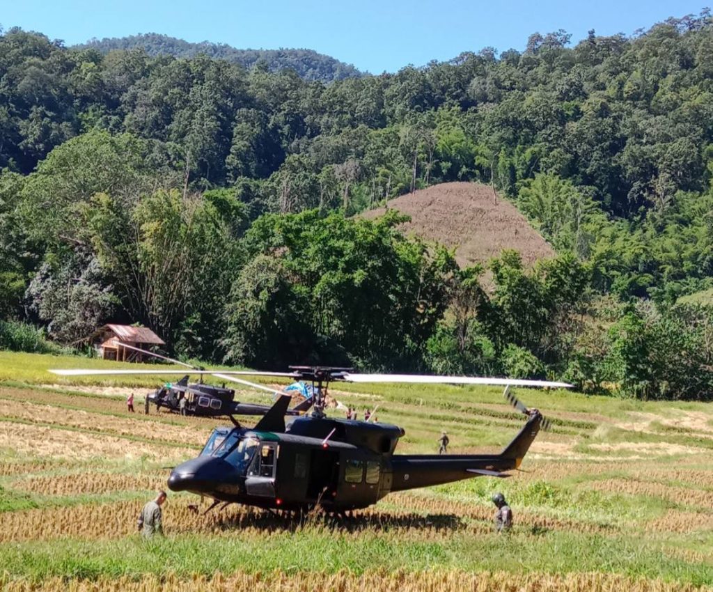 จากกรณีเมื่อวันที่ 16 พฤศจิกายน 2568 เวลาประมาณ 11.00 น. ราษฎรบ้านห้วยต้นนุ่น ต.แม่เงา อ.ขุนยวม จ.แม่ฮ่องสอน แจ้งเหตุพบ เฮลิคอปเตอร์ของ หน่วยเฉพาะกิจสิงหนาท รุ่น เบลล์ 212 จำนวน 1 ลำ ลงจอดฉุกเฉินในที่นาของราษฎรที่เพิ่งเกี่ยวข้าวเสร็จใหม่ ๆ โดยลำแรก ลงที่นาข้าว นายวิศิษฐ์ วิชญพันธ์ ลำที่ 2 ลงที่นาข้าว นายเทพพิทักษ์ ทอผ้าทอง ราษฎร บ.ห้วยต้นนุ่น หมู่ 4 ต.แม่เงา อ.ขุนยวม จ.แม่ฮ่องสอน สร้างความตกใจให้กับราษฎรในพื้นที่เป็นอย่างมาก