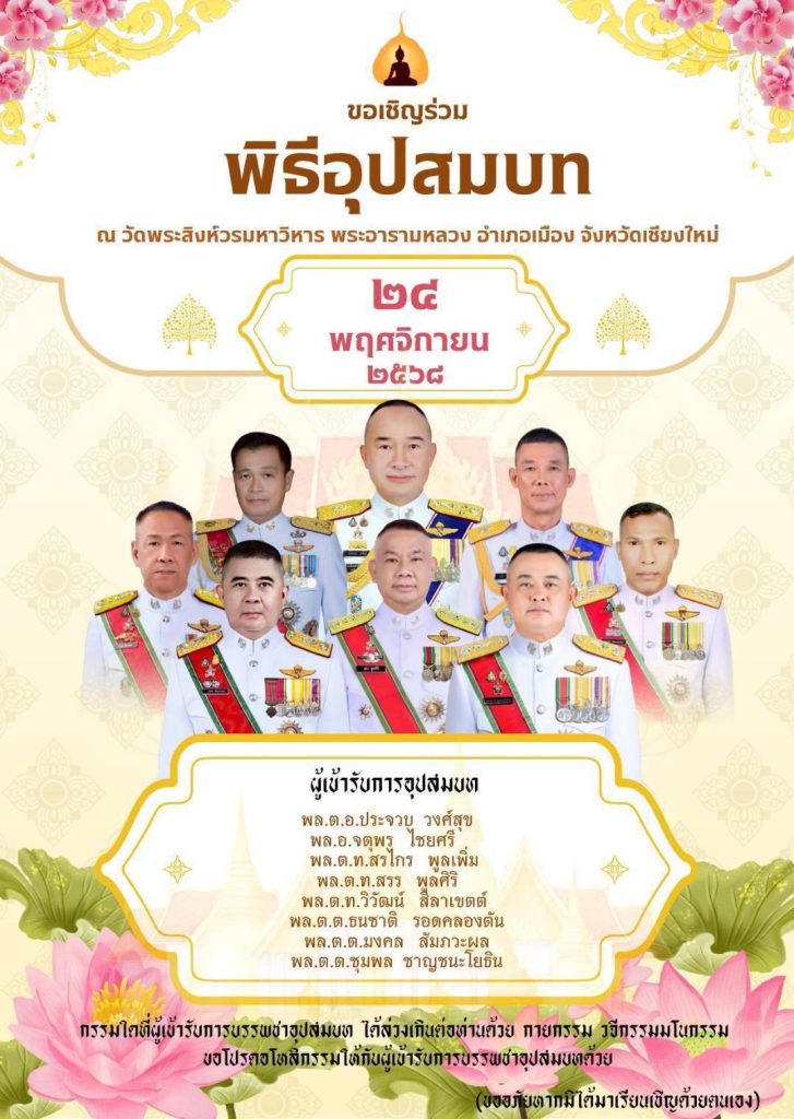เมื่อวันที่ 19 พย 68 พล.ต.อ.ประจวบ วงค์สุข อดีต รอง ผบ.ตร ได้เปิดเผยกับผู้สื่อข่าวว่า ตนพร้อมด้วยนายพลตำรวจ ทหาร จำนวน 8 นาย ซึ่งเกษียณอายุราชการในปีนี้สำนึกในพระมหากรุณาธิคุณ และเพื่อน้อมถวายสมเด็จพระพันปีหลวง เพราะพวกเราเหล่าทหาร ตร.จำนวน 8 นาย เคยรับราชการถวายงานท่านมา รวมถึงทดแทนคุณบิดามารดา ครูบา อาจารย์ ผู้มีพระคุณทุกท่านที่เลึ้ยงดู อบรมสั่งสอนให้พวกเรารับราชการจนเกษียณฯ จึงขออโหสิกรรมแก่ทุกท่านที่เราได้ล่วงเกินไปทั้งกายวาจาใจ จึงพร้อมใจอุปสมบทในวันจันทร์ที่ 24 พฤศจิกายน 2568 ณวัดพระสิงห์วรมหาวิหาร อำเภอเมือง จังหวัดเชียงใหม่