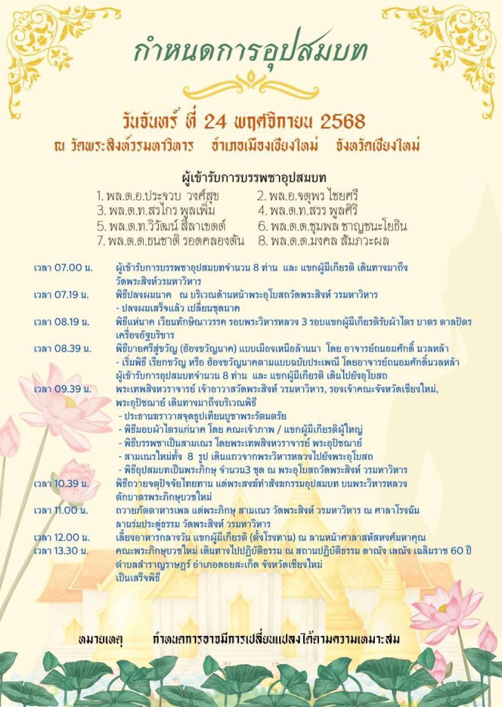 กำหนดการอุปสมบท เวลา 07.00 น. ผู้เข้ารับการบรรพชาอุปสมบทจำนวน 8 ท่าน และ แขกผู้มีเกียรติ เดินทางมาถึงวัดพระสิงห์วรมหาวิหาร