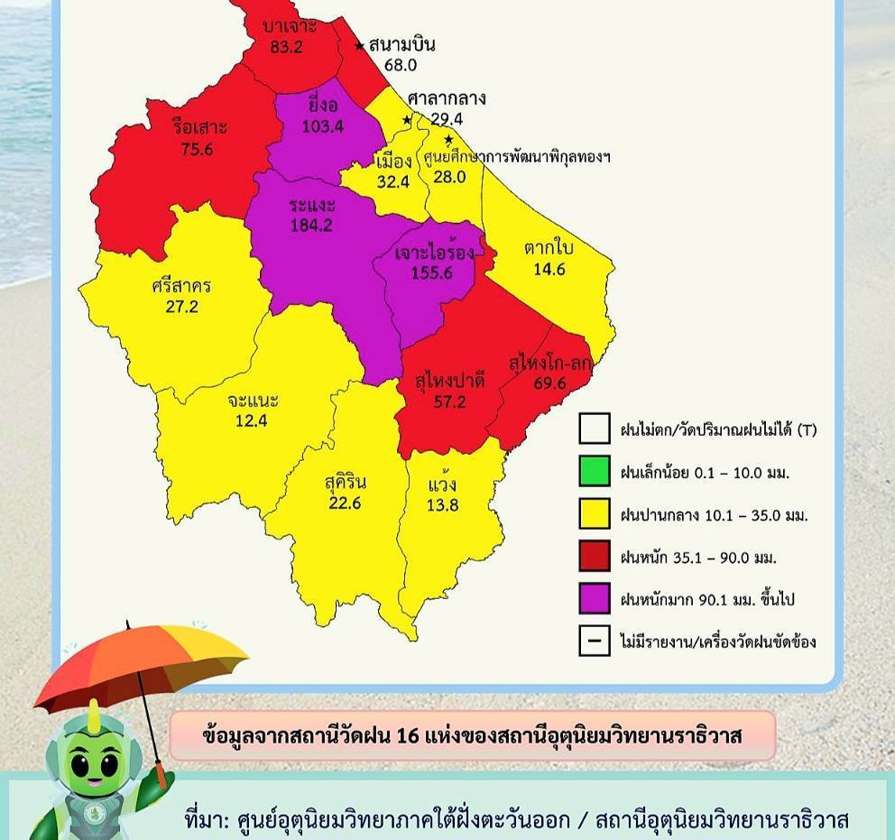 ปริมาณน้ำฝนรายอำเภอของ จ.นราธิวาส ตั้งแต่ 07.00 น.วานนี้ (19 พ.ย.68) ถึง 07.00 น. วันนี้ (20 พ.ย.68) อ.ระแงะ วัดได้ 184.2 มม., อ.เจาะไอร้อง วัดได้ 155.6 มม., อ.ยี่งอ วัดได้ 103.4 มม., อ.บาเจาะ วัดได้ 83.2 มม., อ.รือเสาะ วัดได้ 75.6 มม., อ.สุไหงโก-ลก วัดได้ 69.6 มม. อีก 7 อำเภอ คือ อ.เมือง, อ.สุไหงปาดี, อ.ศรีสาคร, อ.สุคิริน, อ.ตากใบ, อ.แว้ง และ อ.จะแนะ ปริมาณน้ำฝนลดหลั่นลงมาตามลำดับ