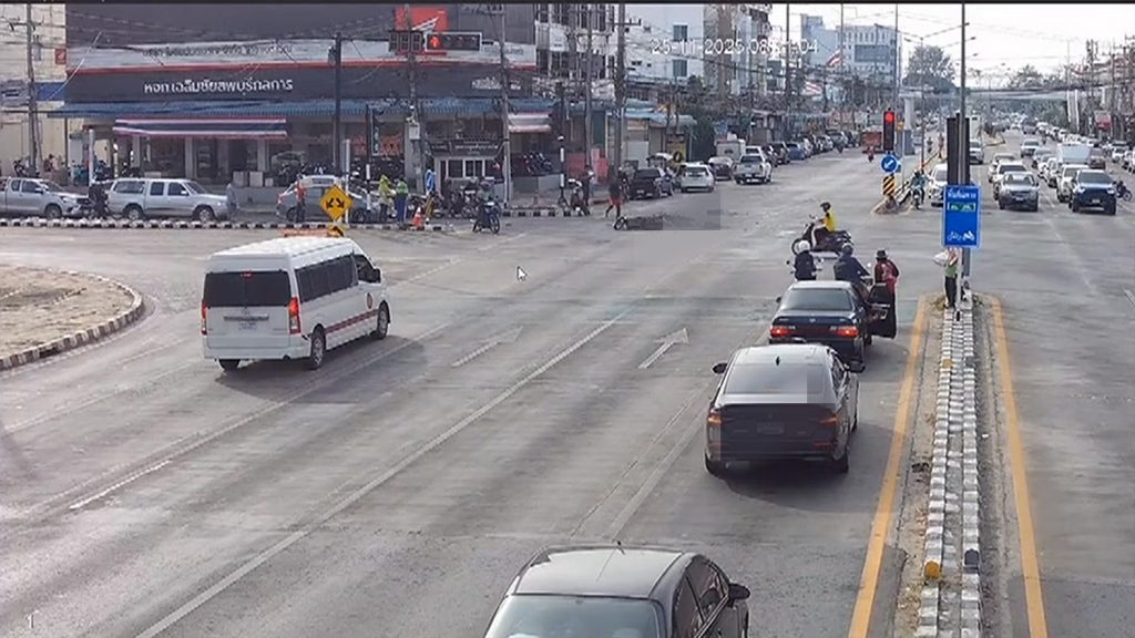 วงจรปิดจับภาพนาทีระทึกรถเทรลเลอร์บรรทุกแร่ 30 ตัน ฝ่าสัญญานสี่แยกไฟแดงชนสยองจักรยานยนต์สองผัวเมียตัวขาดครึ่ง ทางชาวบ้านที่เห็นเหตุการณ์และรถที่จอดรอสัญญาไฟต่างร้องหวีดลั่นถนนด้วยความตกใจ