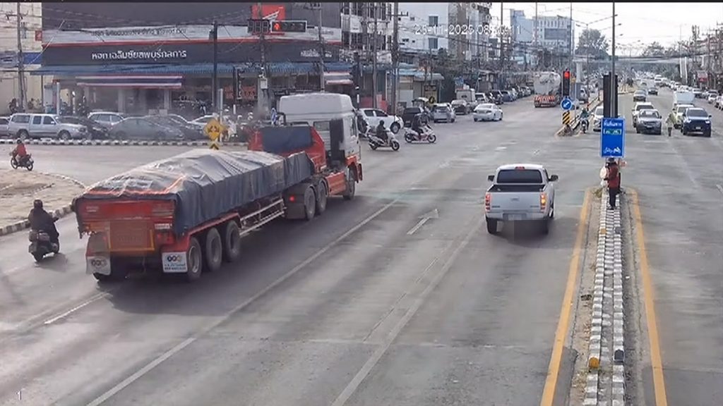 ลพบุรี วงจรปิดจับภาพนาทีระทึกเทรลเลอร์ฝ่าไฟแกงชน รถ จยย.2 ผัวเมียขาดครึ่ง