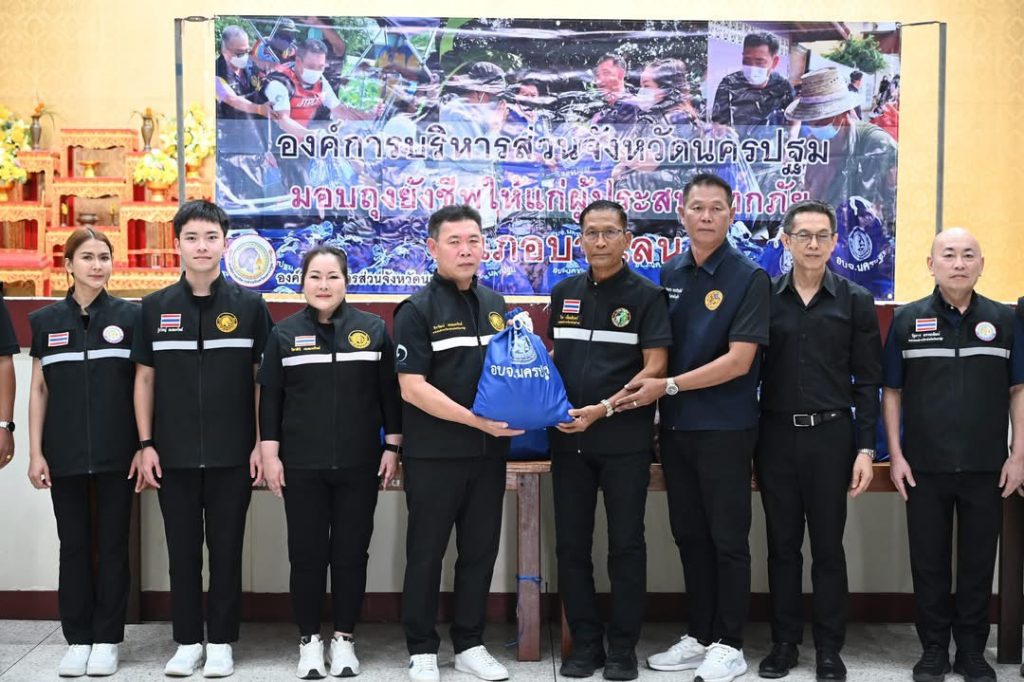 นายจิรวัฒน์ สะสมทรัพย์ นายก อบจ.นครปฐม และ นางวิลาสินี สะสมทรัพย์ ภริยา, นายฐิรวิชญ์ สะสมทรัพย์ บุตรชาย พร้อมด้วย ผู้ช่วยผู้บริหาร ประธานสภาฯ รองประธานสภา สมาชิกสภาฯ รก.ปลัด อบจ. และเจ้าหน้าที่ อบจ.นครปฐม มอบถุงยังชีพให้แก่ผู้นำชุมชนในพื้นที่อำเภอบางเลน เพื่อนำไปส่งต่อให้แก่ประชาชนที่ได้รับความเดือดร้อนจากเหตุอุทกภัย และได้ร่วมลงพื้นที่บ้านประชาชนในตำบลบางหลวง เพื่อให้กำลังใจ และนำถุงยังชีพไปมอบให้แก่ประชาชนที่ยังคงได้รับความเดือนร้อนจากเหตุอุทกภัยในครั้งนี้