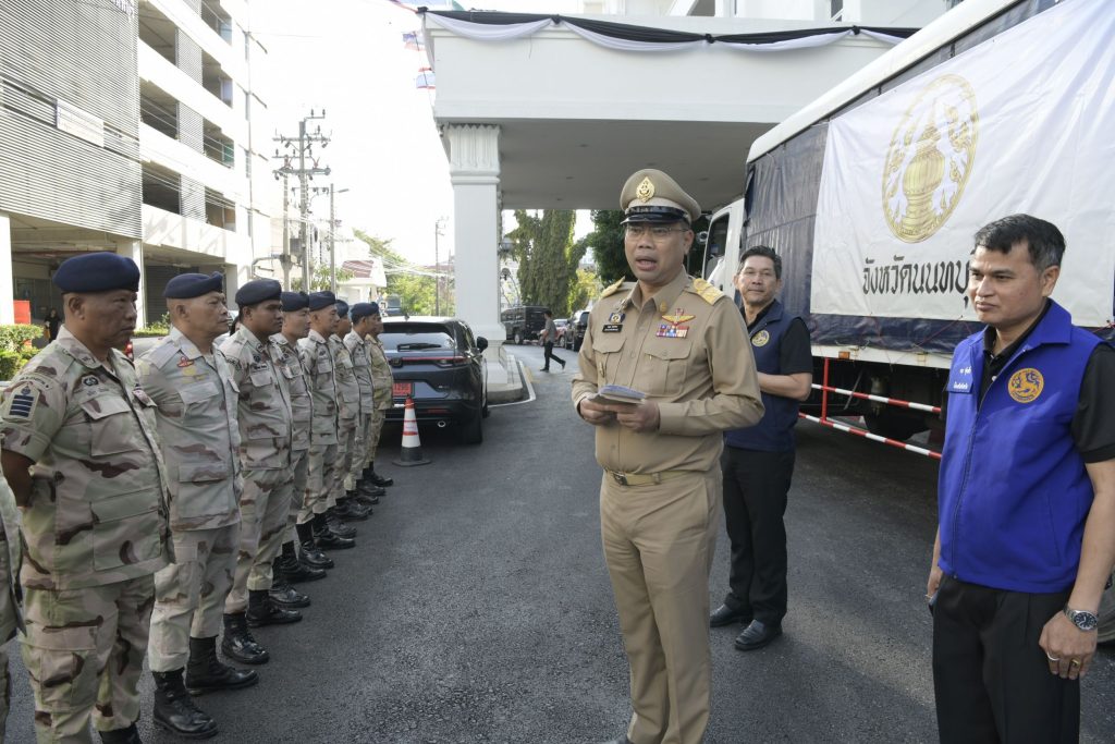วันที่ 27 พฤศจิกายน 2568 เวลา 08.30 น. ที่ศาลากลางจังหวัดนนทบุรี นายเชษฐา โมสิกรัตน์ ผู้ว่าราชการจังหวัดนนทบุรี นายอภิชัย อร่ามศรี รองผู้ว่าราชการจังหวัดนนทบุรี นายชุ้น ณัฐเดช กังสุกุล ปลัดจังหวัดนนทบุรี ร่วมพิธีส่งกำลังพลอาสารักษาดินแดน ลงพื้นที่อำเภอหาดใหญ่ จังหวัดสงขลา เพื่อร่วมสนับสนุนการปฏิบัติภารกิจช่วยเหลือประชาชนที่ได้รับผลกระทบจากสถานการณ์น้ำท่วมในพื้นที่ภาคใต้ โดยจังหวัดนนทบุรีได้จัดเตรียมสิ่งของบริจาคชุดแรก อันประกอบด้วย เครื่องอุปโภคบริโภคที่จำเป็น เพื่อนำไปส่งต่อให้ประชาชนในพื้นที่ประสบภัย และได้จัดส่งไปพร้อมกับกำลังพล อส. ชุดดังกล่าว ซึ่งออกเดินทางในวันนี้