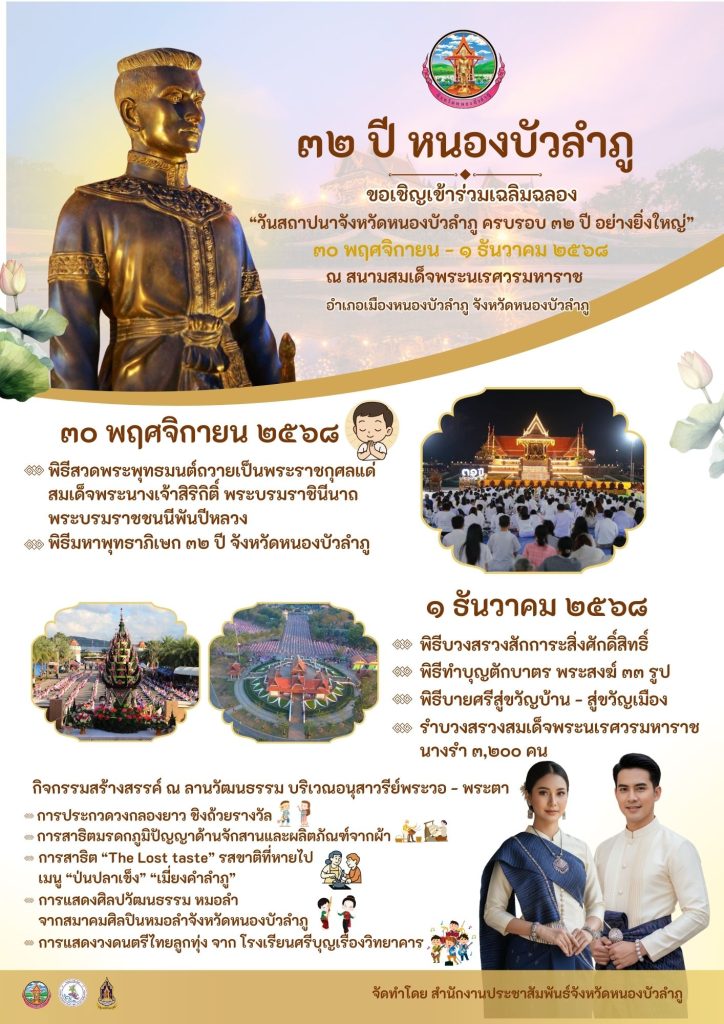 ในโอกาสนี้ นายสุรศักดิ์ อักษรกุล ผู้ว่าราชการจังหวัดหนองบัวลำภู กล่าวว่า“หนองบัวลำภู” เป็นจังหวัดหนึ่งของภาคอีสานตอนเหนือแยกตัวมาจากอุดรธานี ซึ่งได้รับการจัดตั้งขึ้นเป็นจังหวัดหนองบัวลำภู เมื่อวันที่ 1 ธันวาคม พ.ศ.2536 มาถึงวันนี้จังหวัดหนองบัวลำภูมีอายุ 32 ปีเต็ม(ย่าง 33 ปี)โดยในวันที่ 1 ธันวาคม 2568 จะมีกิจกรรมสักการะสิ่งศักดิ์สิทธิ์ จำนวน 7 แห่ง แล้วก็ได้คืนวันที่ 30 พฤศจิกายนปีนี้ จะเป็นกรณีพิเศษก็จะมีการปฏิบัติธรรมทุกอำเภอ นับรวมแล้ว 9,300 คนซึ่งปีนี้ก็จะกระจายไปตามอำเภอต่างๆ เพื่อเจริญพุทธมนต์ส่งเสด็จสู่สวรรคาลัย สมเด็จพระนางเจ้าสิริกิติติ์ พระบรมราชินีนาถ พระบรมราชนนีพันปีหลวง แต่ถ้าจะถามว่าใครเคยมาเที่ยวหนองบัวลำภู หรือรู้จักสถานที่ท่องเที่ยวเด่นๆ ของหนองบัวลำภู คงมีไม่กี่คนที่ตอบได้ อาจเพราะด้วยความที่หนองบัวลำภู เป็นจังหวัดที่อยู่ท่ามกลาง 3 จังหวัดที่เป็นทั้งศูนย์กลางการเดินทางและการท่องเที่ยวอย่างอุดรธานี เลย และขอนแก่น จึงทำให้หนองบัวลำภู กลายเป็นเมืองผ่านที่น้อยคนนักจะแวะเที่ยวชม หนองบัวลำภู