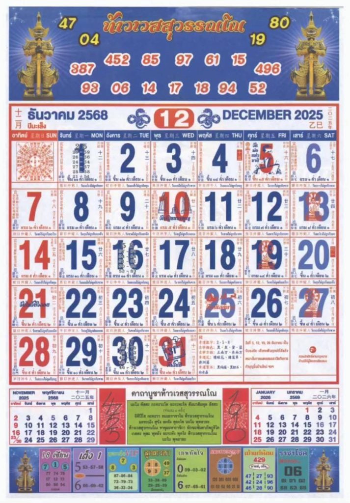 นางสาวพรรณี ลู่ปู่เงิน แม่ค้าขายหวย ย่านถนนเชียงใหม่ ลำพุน อ สารภี เชียงใหม่ ได้เปิดเผยว่า เลขเชื้อพระวงค์ยังคงขายดี คนซื้อไว้เป็นสิริมงคล ประกอบด้วย 89,98,05,09,59,70,10,28,73,74,95,12,24,75,93,94,25,เลข 3 เชื้อพระวงค์ ประกอบด้วย 905,589,598,470,901,728,773,973,495,904,024,812,093,893,475,902,100,468,ยังมีเลขกองทัพเรือ 125,443,เลขเรือหลวง จักกรีนฤเบศร ช่วยน้ำท่วมภาคใต้ 911 มีเลขปฏิทินจีน 567,156,67,56,15 เลขซีเกมส์ครั้งที่ 33 ไทยเจ้าภาพ 9-20 ธค 2568 เลขทีเด็ดงวดนี้ที่คอหวยและประชาชนลี้ยงไว้ คือเลขส่งท้ายปีเก่า รับปีใหม่ ทั้ง คศ และ พ.ศ. ประกอบด้วย 2024,2025 ,2568,2569 หวยงวดเดือนธันวาคม จะออกทั้งหมด 3 ครั้ง คือ วันที่ 1 ธค วันที่ 16 ธค และ วันที่ 30 ธค 68