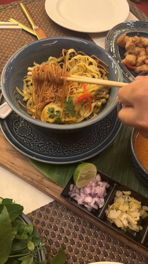 ไอเดียเก๋ ข้าวซอย ตะเกียบลอย นักท่องเที่ยวให้ความสนใจ เอ่ยปาก ชมความคิดริเริ่ม ใช้ชื่อ “ข้าวซอย ชาลานัมเบอร์ซิกส์” แถมรสชาดอร่อย มีทั้งข้าวซอยไก่ ,ข้าวซอยเนื้อ พร้อมเครื่องปรุงข้างเคียงครบครัน