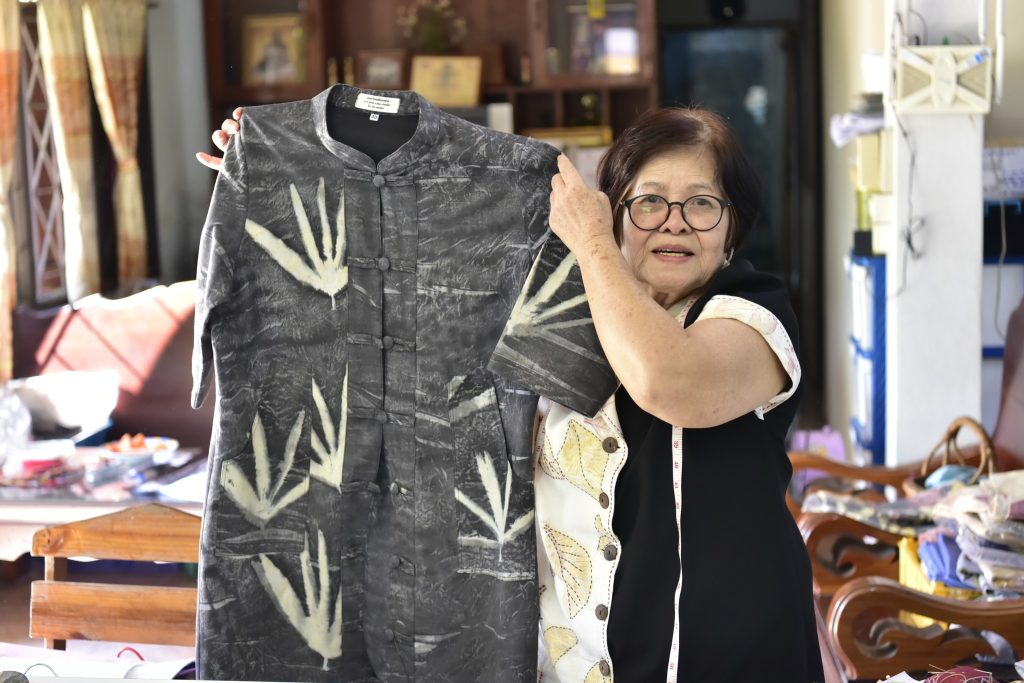 หลักๆใช้สีดำมะเกลือใช้การต้มก่อน ต้มเสร็จก็ใช้ผ้าอีกผืนมาชุบกับน้ำสีมาห่มทับผ้าที่เราเตรียมไว้ กับลายใบไม้ที่เราเตรียมไว้ ใบไม้ที่นิยมจะใช้ใบเฟริน ใบกระจัง ใบใผ่ หรือใบไม้ที่เราเห็นว่ามีลวดลายที่สวยงาม ซึ่งในกลุ่มก็จะช่วยกันออกแบบ จนได้ผ้าโทนสีดำ ที่มีลวดลายเป็นเอกลักษณ์ลวดลายใบไม้ ที่จะไม่มีผ้าผืนไหนซ้ำกันได้ เพราะเป็นการทำผ้าทีละผืน บรรจงวางใบไม้ โดยสมาชิกกลุ่มผู้สูงวัย ที่ช่วยกันทำจากความตั้งใจ จนเป็นที่ยอมรับของหน่วยงานราชการในจังหวัด ปัญหาหนึ่งคือเป็นงานทำด้วยมือทั้งหมด ก็จะค่อยทยอยออกมา เพราะมีหลายขั้นตอน ตั้งแต่การเก็บวัตถุดิบอย่างใบไม้ จากนั้นจึงจะรวมกลุ่มกันทำผ้าเตรียมไว้ การจะนำไปตัดเย็นทำเสื้อ กระเป๋าน้อยใหญ่