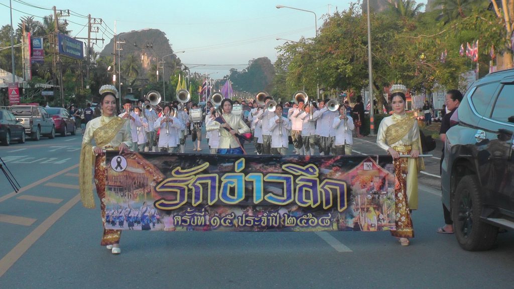 ซึ่งไฮไลน์ของงานคือขบวนพาเหรดเทิดพระเกียรติ ขบวนแห่ศิลปวัฒนธรรม ขบวนวิถีชีวิตพื้นบ้านของแจต่ละตำบล รวม 12 ขบวน ที่บ่งบอกถึงอัตลักษณ์และวัฒนธรรม ประเพณีอันงดงาม ที่มีการสืบทอดและต่อยอดกันมาแต่ตั้งบรรพชนจนถึงปัจจุบันอย่างมั่งคงและยั่งยืน ที่สำคัญไม่ว่าสุภาพบุรุษและสุภาพสตรีมีการแต่งกายย้อนยุคในชุดไทยดั้งเดิม และชุดไทยประยุคที่หาดูไม่ง่ายนักมาร่วมในงานตลอดทั้ง 5 วันของเทศกาลงานรักอ่าวลึกครั้งที่ 15