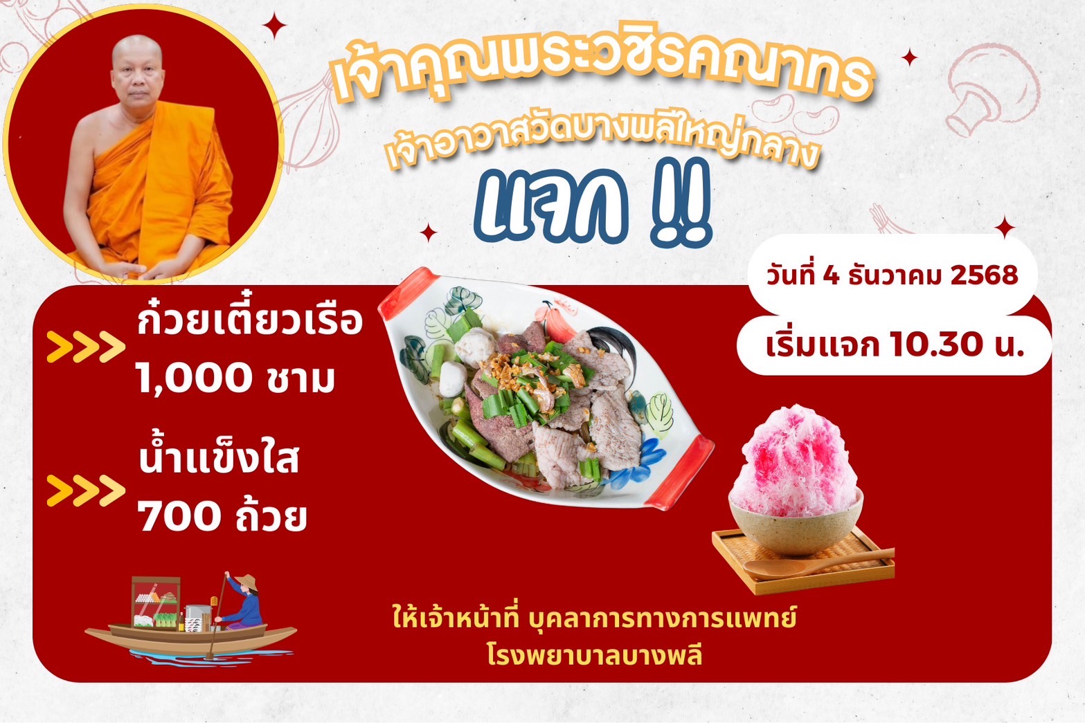 เมื่อเวลา 09.00 น. วันที่ 4 ธันวาคม 2568 ที่ รพ.บางพลี อ.บางพลีใหญ่ อ.บางพลี จ.สมุทรปราการ พระวชิรคณาทร หรือ “เจ้าคุณแจ้” เจ้าอาวาสวัดบางพลีใหญ่กลาง จัดกิจกรรมโรงทานเพื่อสาธารณกุศลครั้งใหญ่ โดยมีวัตถุประสงค์ เพื่ออุทิศถวายเป็นพระราชกุศลแด่สมเด็จพระนางเจ้าสิริกิติ์ พระบรมราชินีนาถ พระบรมราชชนนีพันปีหลวง