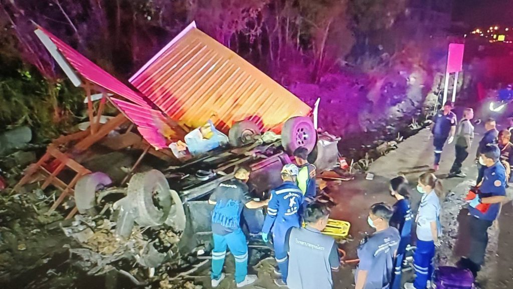 ฉะเชิงเทรา กระบะหลับในพุ่งชนศาลาผู้โดยสารรถพลิกทับร่าง