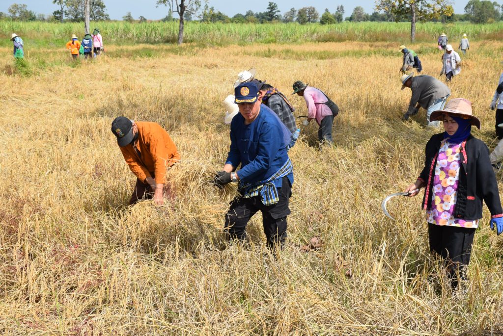 นายเพทาย จรกระโทก นายอำเภอศรีบุญเรือง พร้อมด้วย นางรุจิรา จรกระโทก ประธานแม่บ้านมหาดไทยอำเภอศรีบุญเรือง นายณรงค์ คงสิลา ปลัดอาวุโส นายศักดิ์รินทร์ โพธินาม ปลัดอำเภอหัวหน้าฝ่ายความมั่นคง พร้อมปลัดอำเภอ คณะเยาวชนประชาชนค่ายคนดี นายสมยศ อุประ ส.อบจ.หนองบัวลำภู พัฒนาการอำเภอศรีบุญเรือง เดินทางไปร่วมกับชาวบ้านฝายหิน กำนัน ผู้ใหญ่บ้าน ชุดรักษาความปลอดภัยหมู่บ้าน (ชรบ.) ราษฎรจิตอาสา ภาคีเครือข่าย และพี่น้องชาว “ค่ายคนดีศรีบุญเรือง” เข้าร่วมกิจกรรมฯ รวมกำลังพลกว่า 200 ชีวิต ที่เป็นประเพณีลงแขกเกี่ยวข้าว นาหลวงวัดพรหมวิหาร 4 ชุมชนฝายหิน”
