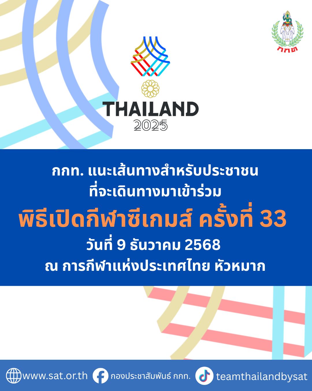กกท. แนะเส้นทางสำหรับประชาชนที่จะเดินทางมาเข้าร่วมพิธีเปิดกีฬาซีเกมส์ ครั้งที่ 33 วันที่ 9 ธันวาคม 2568 ณ การกีฬาแห่งประเทศไทย หัวหมาก
