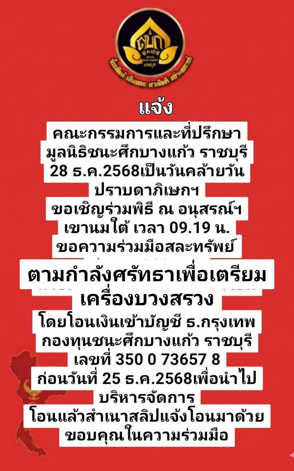ตามกำลังศรัทธาเพื่อเตรียม เครื่องบวงสรวง โดยโอนเงินเข้าบัญชี ธ.กรุงเทพ กองทุนชนะศึกบางแก้ว ราชบุรี เลขที่ 350 0 73657 8