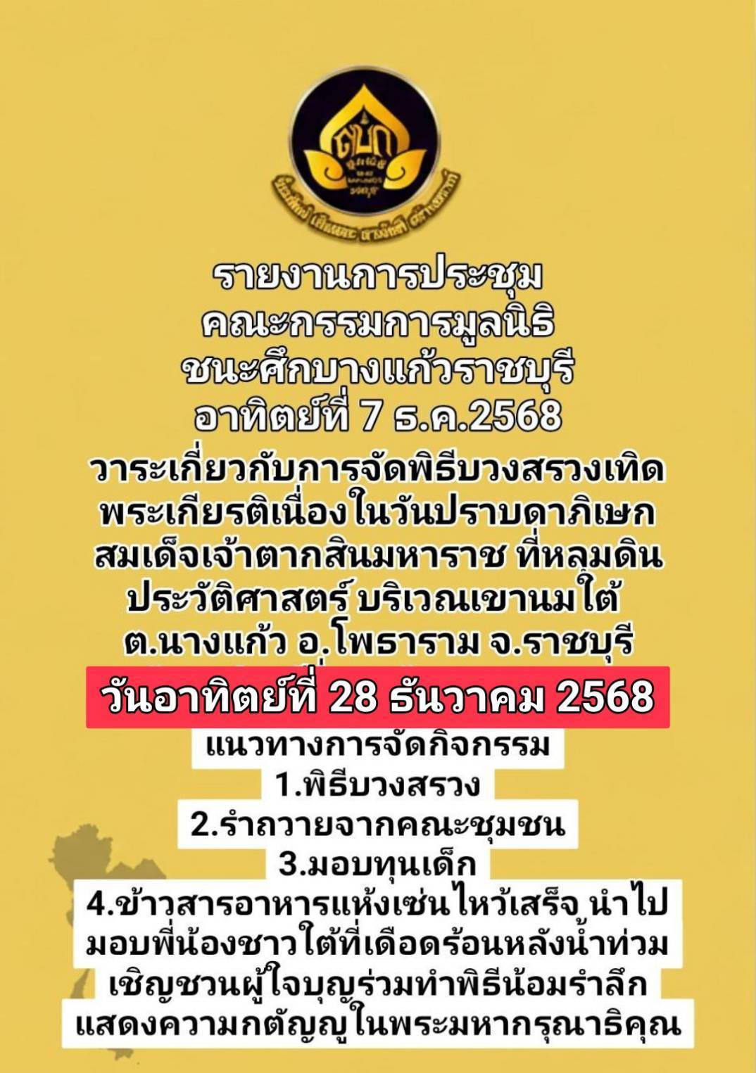 รายงานการประชุม คณะกรรมการมูลนิธิ ชนะศึกบางแก้วราชบุรี อาทิตย์ที่ 7 ธ.ค.2568 วาระเกี่ยวกับการจัดพิธีบวงสรวงเทิด พระเกียรติเนื่องในวันปราบดาภิเษก สมเด็จเจ้าตากสินมหาราช ที่หลุมดิน ประวัติศาสตร์ บริเวณเขานมใต้ ต.นางแก้ว อ.โพธาราม จ.ราชบุรี วันอาทิตย์ที่ 28 ธันวาคม 2568
