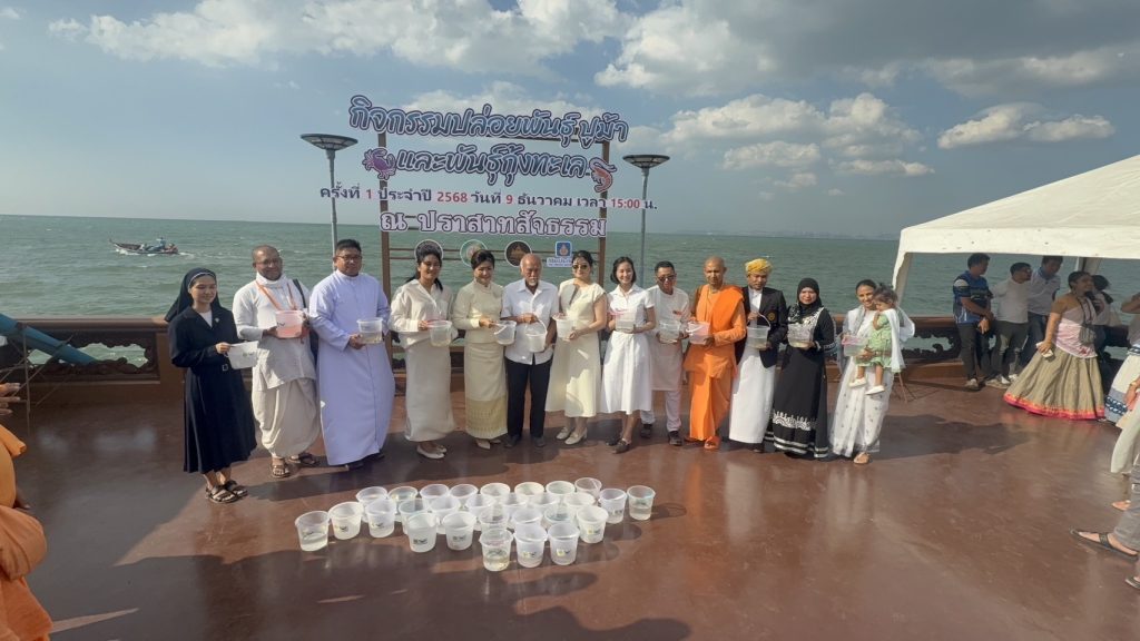 เวลา 15.30 น.วันที่ 8 ธ.ค.68 ประชาชนและนักท่องเที่ยวทั้งชาวไทยและชาวต่างชาติจำนวนมากเข้าร่วมกิจกรรมปล่อยพันธุ์ปูม้าและพันธุ์กุ้งทะเล ครั้งที่ 1 ประจำปี 2568 ณ ปราสาทสัจธรรม พัทยา จ.ชลบุรี