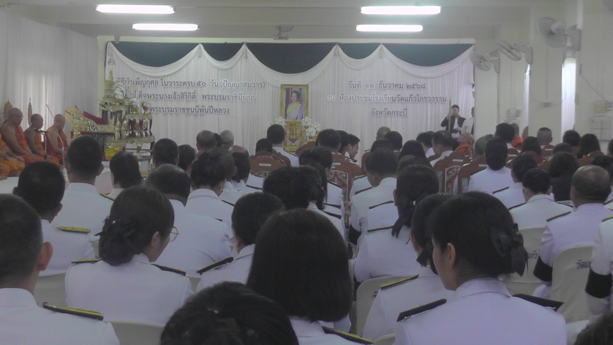 เมื่อวันที่ 12 ธันวาคม 2568 เวลา 10.00 นาฬิกา ที่ห้องประชุมโรงเรียนพระปริญัติธรรมวัดแก้วโกรวารามพระอารามหลวงจังหวัดกระบี่ ถนนคงคา เขตเทศบาลเมืองกระบี่ ตำบลปากน้ำ อำเภอเมืองกระบี่ จังหวัดกระบี่ นายอังกูร ศีลาเทวากูล ผู้ว่าราชการจังหวัดกระบี่ เป็นประธานฝ่ายคฤหัสถ์ และพระวชิรปัญญา เจ้าอาวาสวัดแก้วโกรวารามพระอารามหลวงจังหวัดกระบี่ รองเจ้าคณะอำเภอเมืองกระบี่ เป็นประธานฝ่ายสงฆ์ พร้อมด้วยข้าราชการพลเรือน ข้าราชการตุลาการ อัยการ ตำรวจ ทหาร ผู้บริหารองค์กรปกครองส่วนท้องถิ่น พนักงานรัฐวิสาหกิจ ภาคเอชกน กลุ่มพลังมวลน และประชาชนทุกหมู่เหล่า พร้อมใจกันร่วมพิธีบำเพ็ญกุศลปัญญาสมวาร ครบ 50 วัน เสด็จสู่สวรรคาลัย ถวายพระราชกุศลเบื้องหน้าพระฉายาลักษณ์ สมเด็จพระนางเจ้าสิริกิติ์ พระบรมราชินีนาถ พระบรมราชชนนีพันปีหลวง