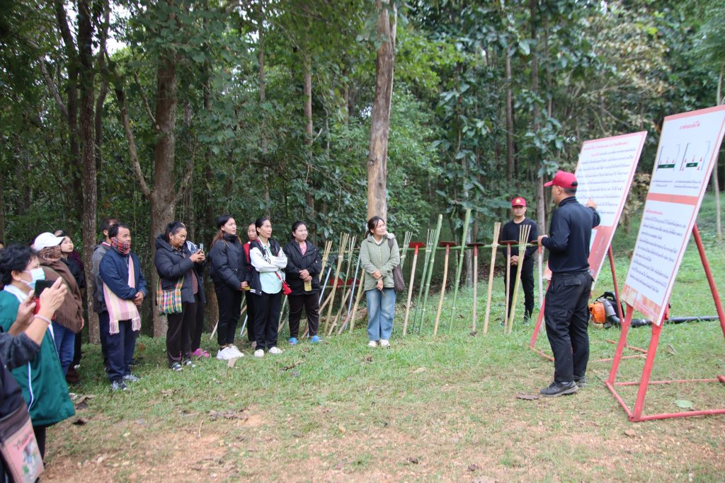 หลังจากประชาชนที่เข้ารับการอบรมได้รับความรู้ความเข้าใจทางภาคทฤษฏีแล้ว ได้ทำการแบ่งกลุ่มประชาชนให้เจ้าหน้าที่จากสถานีควบคุมไฟป่าจังหวัดแม่ฮ่องสอน มาทำการสาธิตวิธีการทำแนวกันไฟรอบ ๆ บริเวณพื้นที่หมู่บ้านชุมชนที่ถูกต้องเมื่อเกิดไฟป่าจะต้องทำแนวกันไฟตรงไหนเพื่อไม่ให้ไฟป่าลุกลามเข้ามาในหมู่บ้านหรือรอบ ๆ บริเวณพื้นที่ป่าใกล้เคียง พร้อมกับสาธิตการใช้ไม้ตบไฟป่าและเครื่องเป่าลมในการแยกเชื้อเพลิงให้ออกห่างจากไฟป่าที่กำลังลุกไหม้ เมื่อเกิดไฟป่าขึ้นในทุกระดับทั้งระดับเล็ก ระดับกลาง ระดับใหญ่ ประชาชนควรจะรู้วิธีการเข้าไประงับเพลิงที่ถูกต้องถูกวิธีจะได้ไม่เป็นอันตรายต่อตนเอง และสามารถควบคุมเพลิงไว้ได้ไม่ให้ลุกลามต่อไป