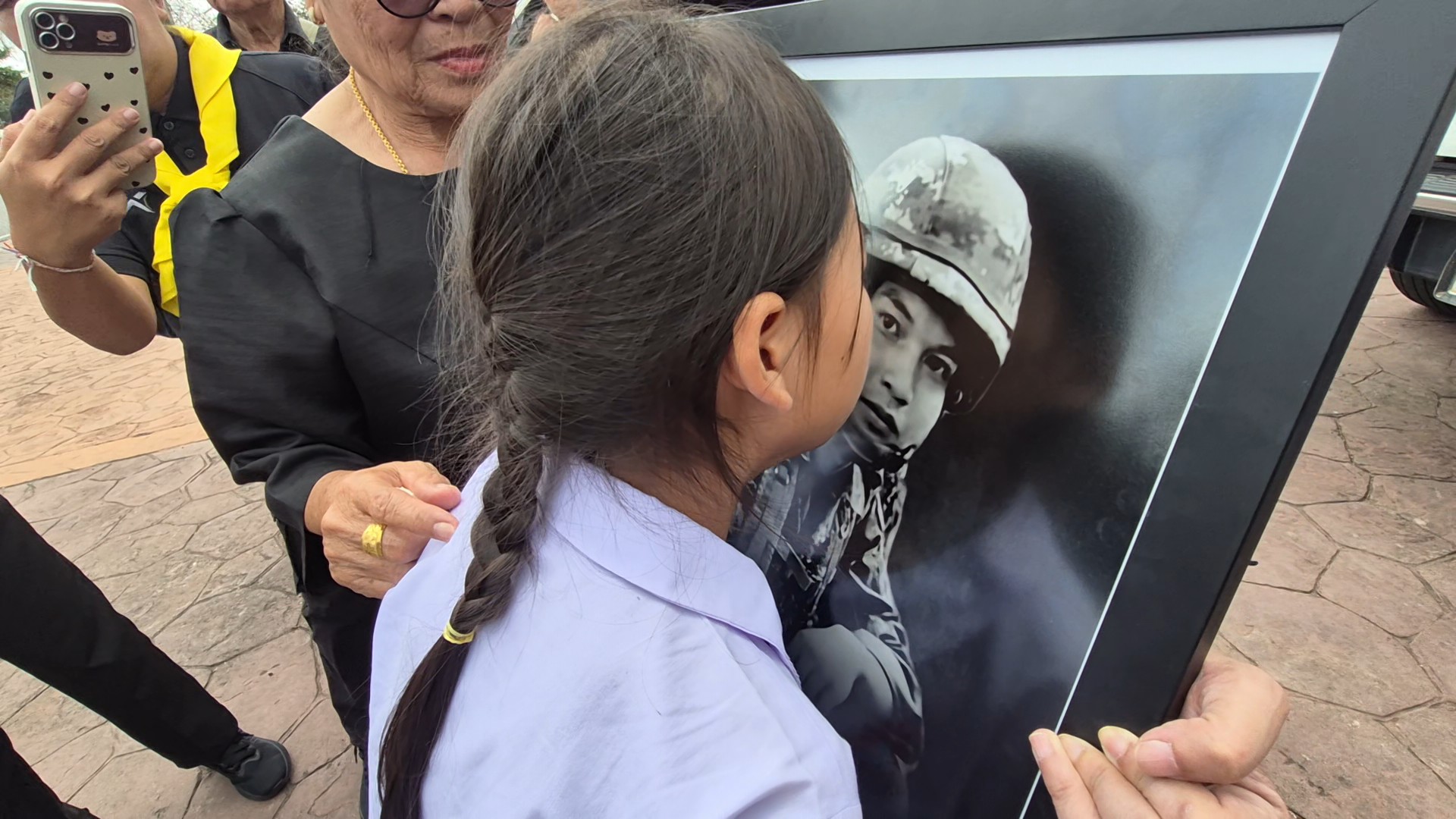 ต่อมาในเวลา 12.00 น.วันเดียวกัน (12 ธ.ค.) เจ้าหน้าที่ทหาร ได้พาญาติได้ออกจากห้องรับรอง มทบ. 24 เพื่อไปรอรับร่างพลทหารธนรัตน์ ที่กองบิน 23 ซึ่ง ด.ญ.ชมพู่ จันทร์ประทัด หรือน้องชมพู อายุ 9 ขวบ น้องสาวของพลทหารธนรัตน์ ได้เดินถือรูปถ่ายของพี่ชายออกมาที่หน้าตึกกองบัญชาการ มทบ. 24 ก่อนจะขึ้นรถตู้ สภ.เฝ้าไร่ ที่พาญาติมารับร่างวีระบุรุษบึงตะกวน น้องชมพู่ได้หอมแก้มรูปถ่ายพี่ชาย พร้อมกับสะอื้นร่ำไห้บอกพี่ชายว่า “กลับบ้านเรานะ หนูอยากเป็นทหารเหมือนพี่” สร้างความสะเทือนใจให้กับญาติและผู้พบเห็น