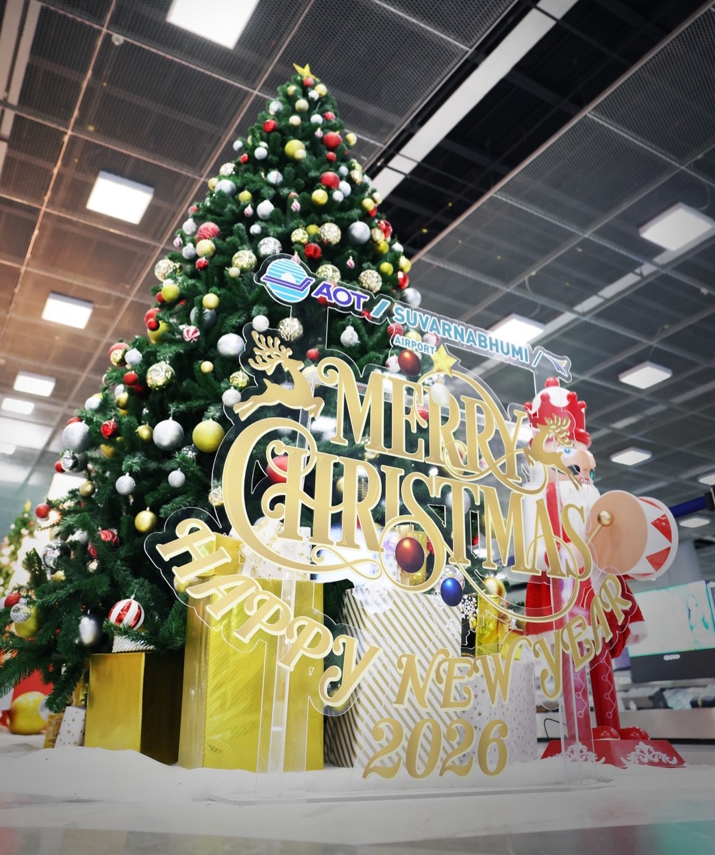 ท่าอากาศยานสุวรรณภูมิ (ทสภ.) ต้อนรับเทศกาลคริสต์มาสและปีใหม่ 2569 ด้วยการประดับตกแต่งพื้นที่ภายในอาคารผู้โดยสารและอาคารเทียบเครื่องบิน ภายใต้คอนเซ็ปต์ “Glamour X Mas in Warm Red” ถ่ายทอดกลิ่นอายแห่งความสุข ความอบอุ่น และความรื่นเริงในช่วงเทศกาลปลายปี