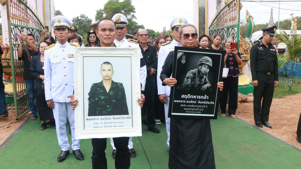 วันที่ 12 ธันวาคม 2568 มณฑลทหารบกที่ 24 จังหวัดอุดรธานี ได้จัดกำลังพลและยานพาหนะ ประกอบพิธีเคลื่อนศพ พลทหารธนรัตน์ จันทร์ประทัด อายุ 22 ปี กองกำลังรบกองทัพภาคที่ 1 กำลังพลกองพลทหารราบที่ 11 ตำแหน่งพลปืนเล็ก สังกัดกรมทหารราบที่ 112 กองพันทหารราบที่ 3 (ร.112 พัน.3) วีรบุรุษทหารกล้าผู้ซึ่งพลีชีพเสียชีวิตในขณะปฏิบัติหน้าที่ป้องกันอธิปไตยตามแนวชายแดนไทย-กัมพูชา ถูกกระสุนปืน ค. ของฝ่ายกัมพูชาตกใส่ในสมรภูมิบึงตะกวน-บ้านคลองแผง อ.ตาพระยา จ.สระแก้ว ถูกส่งไปยัง รพ.ค่ายจักรพงษ์ และเสียชีวิตในเวลาต่อมา กลับสู่บ้านเกิดที่บ้านเลขที่ 41 หมู่ที่ 8 บ้านวังชมภู ต.เฝ้าไร่ อ.เฝ้าไร่ จ.หนองคาย ก่อนเคลื่อนศพไปประกอบพิธีน้ำหลวงอาบศพที่วัดแก้วสวัสดิ์ บ้านวังชมภู ต.เฝ้าไร่ อ.เฝ้าไร่ จ.หนองคาย โดยมีนายวิรัตน์ จันทร์ประทัด อายุ 74 ปี ,นางนกแก้ว จันทร์ประทัด อายุ 67 ปี ปู่และย่า พร้อมด้วยนายสมภพ จันทร์ประทัด อายุ 47 ปี พ่อ และน้องสาว พร้อมด้วยญาติ รอรับศพ บรรยากาศเป็นไปด้วยความโศกเศร้า