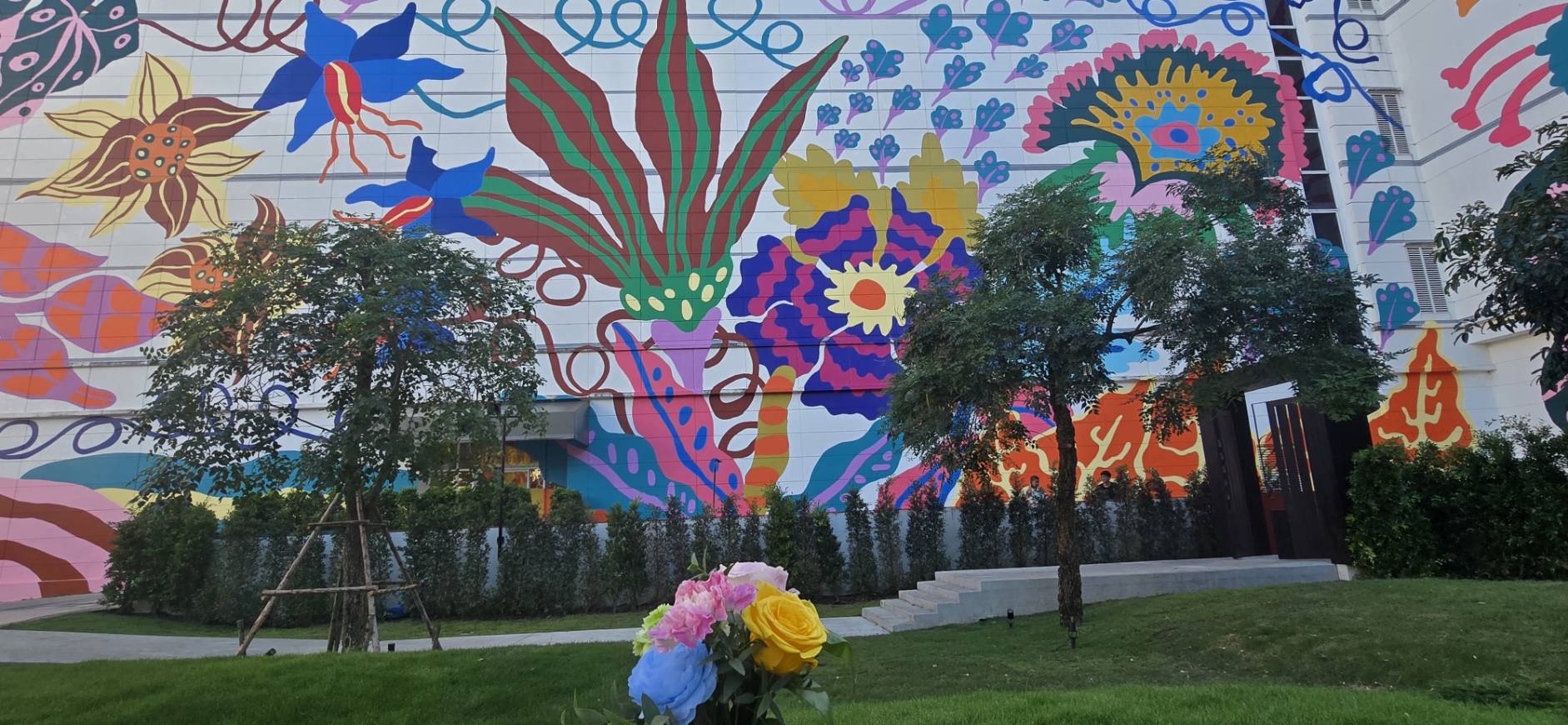 ขณะเดียวกัน ผนังอาคารโดยรอบทั้ง 3 ด้าน ได้รับการตกแต่งด้วย ภาพเขียนและภาพวาดเชิงจินตนาการ ถ่ายทอดลวดลายพรรณไม้ที่พลิ้วไหว เสมือนมีชีวิต ช่วยเพิ่มสีสันและอัตลักษณ์ทางศิลปะให้กับพื้นที่