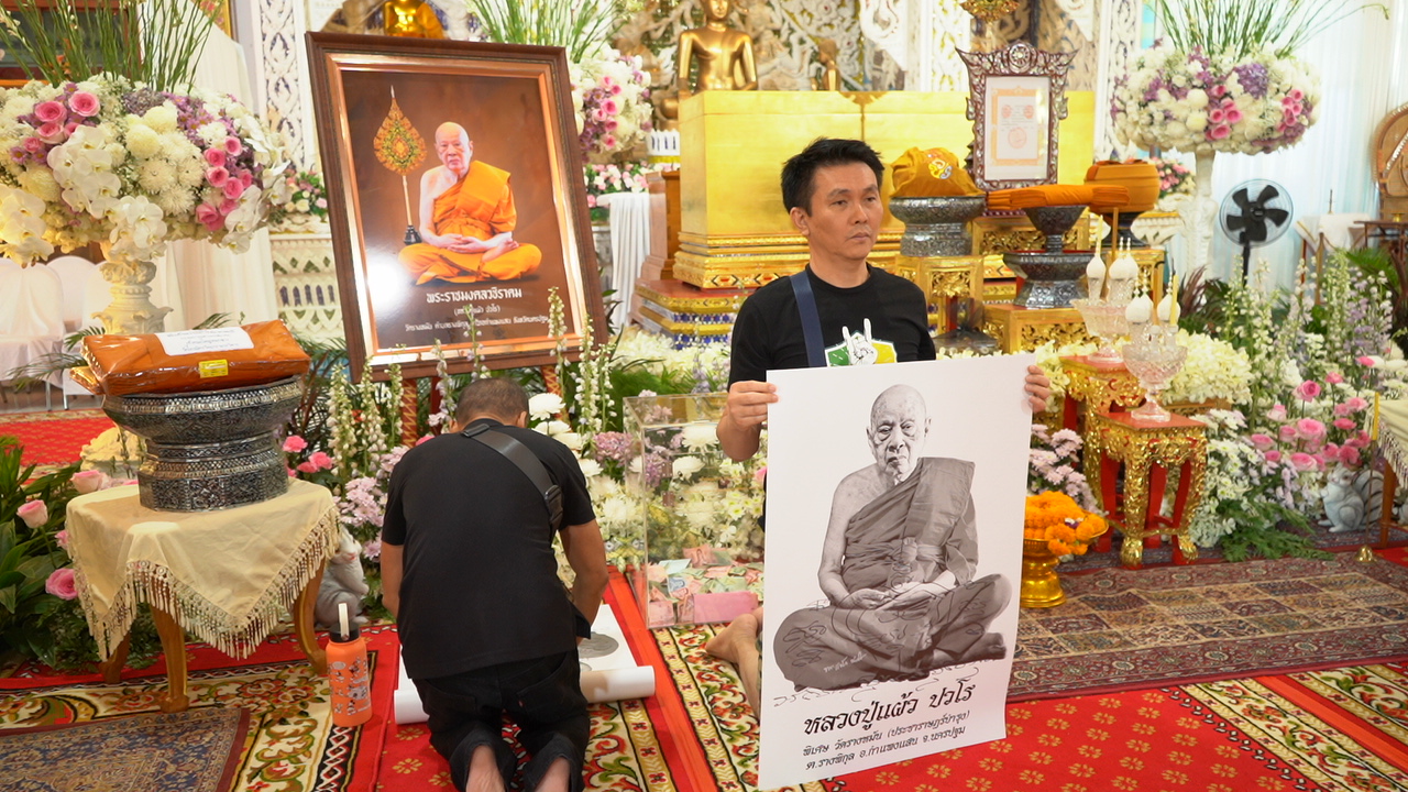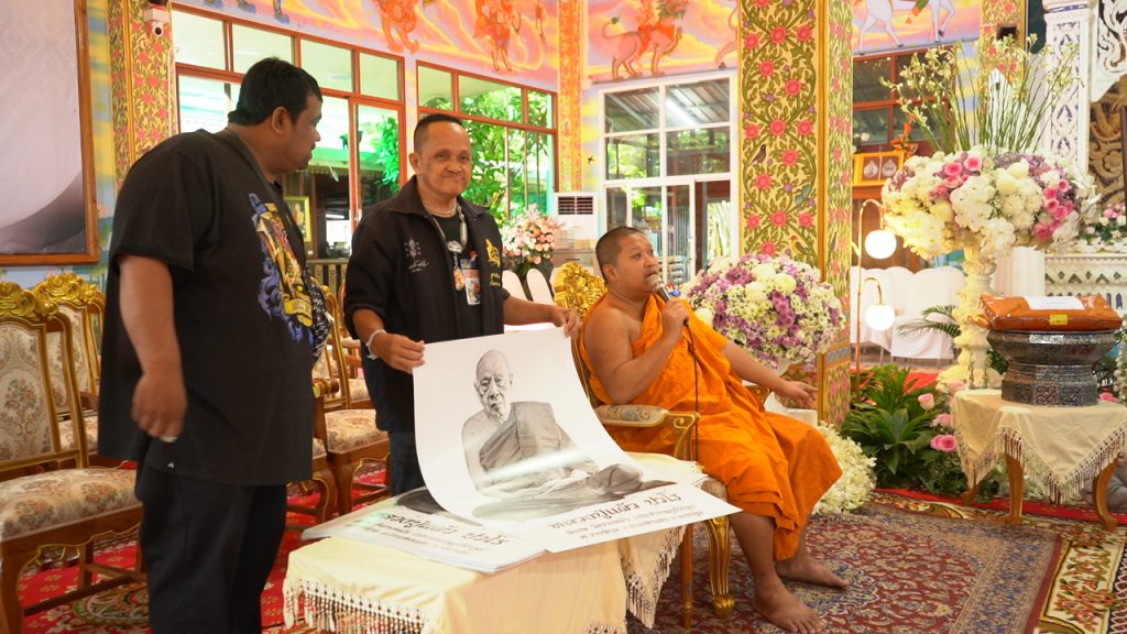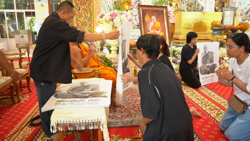 แจกฟรีประชาชนแห่รับรูปภาพโปสการ์ดหลวงปู่แผ้ว ปวโร ลงยันต์ปลุกเสกขนาดใหญ่ ในสมัยที่หลวงยังมีอายุ 99 ปี เพียงเข้ากราบสักการะร่างหลวงปู่ในอาคารกุฏิร่มเย็น และทำบุญตามศรัทธา ก็จะได้รับภาพหลวงปู่แผ้ว ปวโร ขาวดำ ขนาดความกว้าง 24X35 นิ้ว มูลค่า 1,000 บาท ฟรี ตลอดทั้งวัน