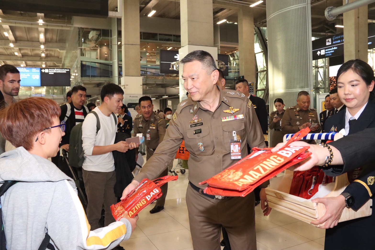 เมื่อวันที่ 22 ธ.ค.2568 เวลา 16.00 น. พล.ต.ท.ภาณุมาศ บุญลักษม์ ผบช.สตม. พร้อมด้วยผู้บริหารระดับสูงของ สตม. และนายทศพล วรรณศุภผล ผู้อำนวยการกองส่งเสริมกิจกรรม ได้ร่วมกันปล่อยแถวเจ้าหน้าที่ตรวจคนเข้าเมือง ณ ท่าอากาศยานสุวรรณภูมิ เพื่ออำนวยความสะดวกด้านพิธีการเข้าเมืองในช่วงเทศกาลคริสต์มาส–ปีใหม่ 2569 ในการนี้ เจ้าหน้าที่ตรวจคนเข้าเมืองได้ร่วมกันให้การต้อนรับนักท่องเที่ยวขาเข้าจากต่างประเทศ พร้อมมอบของที่ระลึก “Amazing Bag” ซึ่งบรรจุของที่ระลึกเสน่ห์ไทย สะท้อนอัตลักษณ์และไมตรีจิตของคนไทย เพื่อสร้างความประทับใจตั้งแต่ก้าวแรกที่นักท่องเที่ยวเดินทางมาถึงประเทศไทย