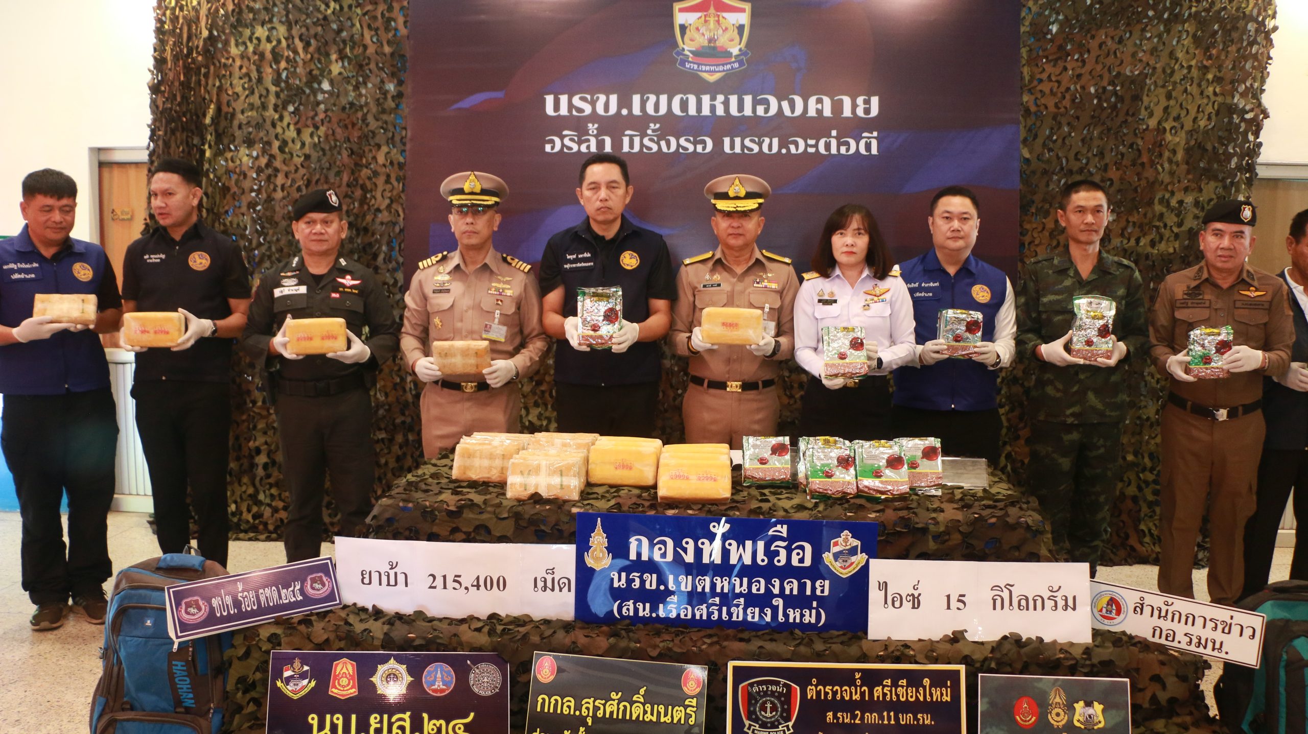 วันที่ 23 ธ.ค. 68 ที่ นรข.เขตหนองคาย นายไพฑรูย์ มหาชื่นใจ รอง ผวจ.หนองคาย,พล.ร.ต.ณรงค์ เอมดี ผบ.นรข.,น.อ.วิศิษฐ์พงศ์ เจริญวิชยเดช ผบ.นรข.เขตหนองคาย,นางสาววรรณา ผู้อุตส่าห์ นายด่านศุลกากรหนองคาย,นายจรัล กลางประดิษฐ นอภ.ศรีเชียงใหม่,พ.ต.อ.เตชรัฐ ประทุมชาติ ผกก.สภ.ท่าบ่อ,นายชัยสิทธิ์ คำภาจันทร์ หน.ศูนย์อำนวยการป้องกันและปราบปรามยาเสพติดจังหวัดหนองคาย ร.ต.ไชโย หรพูน บก.ควบคุมที่ 2 (ร.13) กกล.สุรศักดิ์มนตรี ตชด.245 และหน่วยงานความมั่นคง ร่วมกับแถลงข่าวผลการจับกุม 2 ผู้ต้องหาหนุ่มลาว และ ผู้เฒ่าไทย ยาบ้า 215,400 เม็ด และ ไอซ์ 15 กก. ขณะพยายามลักลอบนำเข้าจากประเทศเพื่อนบ้าน รถยนต์ มิตซูบิชิ สีขาว ทะเบียน บธ 80 ปราจีนบุรี ได้ที่บริเวณริมฝั่งโขงหลังวัดศรีสุธรรม ต.โพนสา อ.ท่าบ่อ .หนองคาย