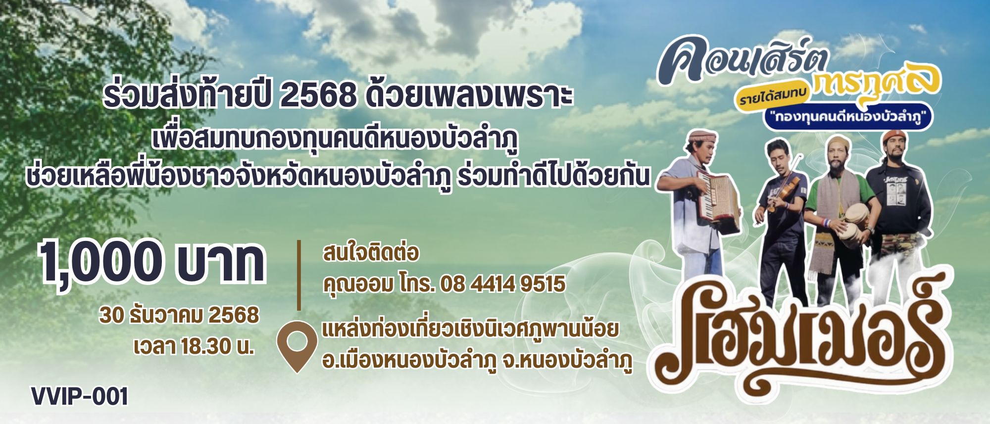 วันนี้(24 ธค.68)ผู้สื่อข่าวได้รับการเปิดเผยจาก นายสุรศักดิ์ อักษรกุล ผู้ว่าราชการจังหวัดหนองบัวลำภู ว่าในวันอังคารที่ 30 ธันวาคม 68 นี้ ก่อนวันส่งท้ายปีเก่าต้อนรับปีใหม่ เชิญพ่อแม่พี่น้องชาวจังหวัดหนองบัวลำภู และจังหวัดอุดรธานี ตลอดจนนักท่องเที่ยวที่เคารพทุกท่าน วันนี้ผมขอประชาสัมพันธ์เชิญชวนทุกๆท่านที่ทราบข่าวนี้ เรามีนัดกันที่ภูพานน้อย แหล่งท่องเที่ยวที่สวยงามยามเช้าๆและยามค่ำคืน ไปสัมผัสอากาศที่แสนบริสุทธิ์สบายๆยามค่ำๆวันที่ 30 ธันวาคม 2568 นี้ที่ภูพานน้อยเรามีคอนเสิร์ตการกุศลมีศิลปินเพื่อชีวิต ก็คือ”วงแฮมเมอร์”จะมาแสดงให้กับผู้ที่ชื่นชอบดนตรีในยุค 90 พลาดไม่ได้ งานนี้เป็นคอนเสิร์ตการกุศล ขอความร่วมมือจำหน่ายบัตรใบละ 1.000 บาทเพื่อเอาเงินทั้งหมดเข้ากองทุนคนดีหนองบัวลำภู และก็กองทุนต่างๆที่ให้กับจิตอาสาที่เราใช้ชื่อว่ากองทุนคนดีหนองบัวลำภู