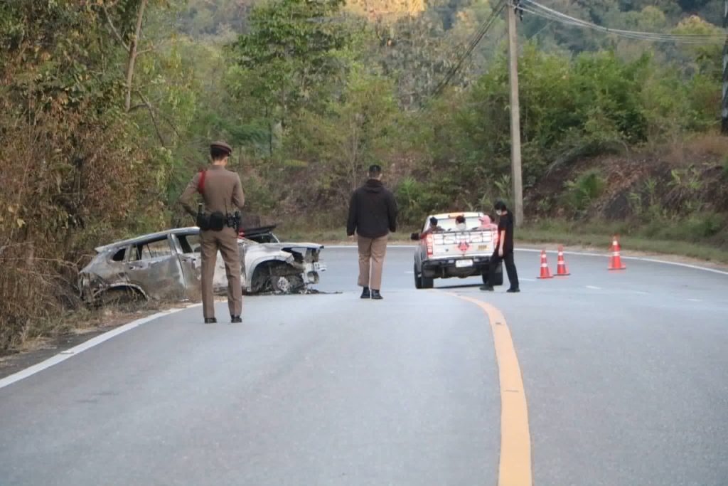 จุดที่เกิดเหตุนั้นเป็นช่วงทางโค้ง พบว่าผู้ประสบเหตุเป็นครอบครัวชาวสเปน 4 คนพ่อแม่ลูก ได้สื่อสารกับเจ้าหน้าตำรวจว่า ตนเองเดินทางมาท่องเที่ยวในไทยและมีจุดมุ่งหมายจะเดินทางต่อไปที่จังหวัดแม่ฮ่องสอน โดยเฉพาะบ้านรักไทย ที่เคยได้ยินชื่อเสียงมานาน แต่ระหว่างเดินทางรถสะดุดกับตอไม้และทำให้รถไถลลงไปข้างทาง ซึ่งรถเป็นรถโตโยต้า รุ่น Cross ที่เช่ามาจากจังหวัดเชียงใหม่ หมายเลขทะเบียน กรุงเทพมหานคร 4ขห-9347 ขณะที่เกิดเหตุตกใจมาก เพราะเกิดประกายไฟที่ห้องเครื่องยนต์ ก่อนจะลุกลามมายังตัวรถอย่างรวดเร็ว ตนเองจึงรีบบอกให้ทุกคนรีบออกจากรถรถ ก่อนที่เพลิงจะลุกไหม้อย่างรวดเร็ว จนไม่สามารถนำเอกสารสำคัญหรือของมีค่าอื่นๆ ออกมาได้เลย