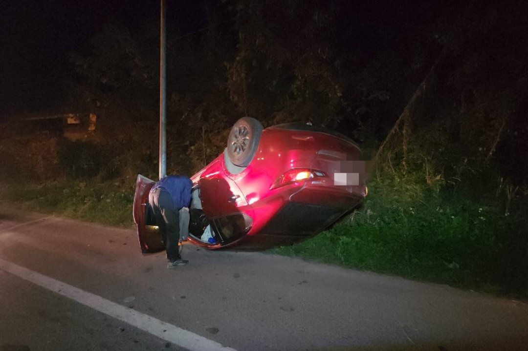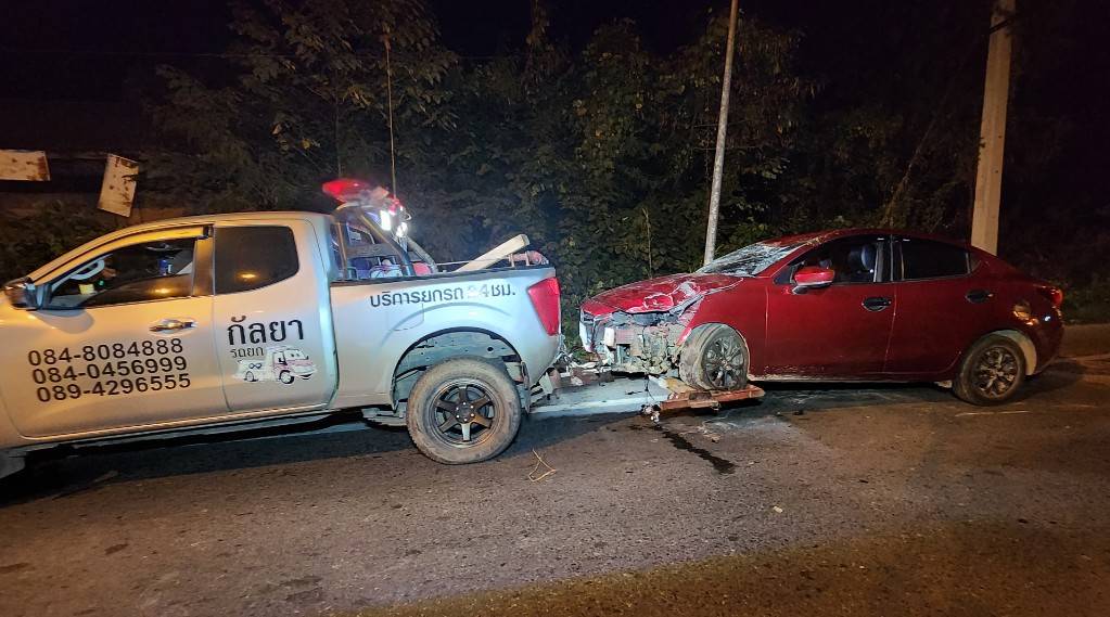 จากการตรวจสอบพบรถยนต์เก๋ง ยี่ห้อ Mazda 2 สีแดง ทะเบียน กรุงเทพมหานคร สภาพรถพลิกคว่ำ ล้อชี้ฟ้า ได้รับความเสียหายอย่างหนักทั้งคัน หลังชนเสาไฟฟ้าริมถนน