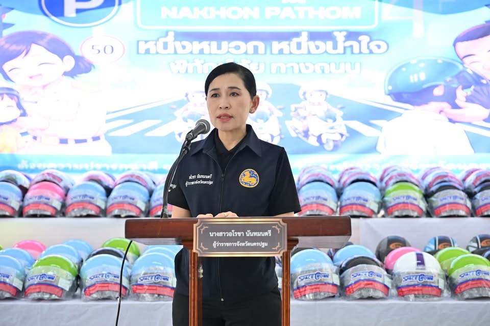 วันที่ 26 ธันวาคม 2568 ที่ศาลากองอำนวยการองค์พระปฐมเจดีย์ อำเภอเมือง จังหวัดนครปฐม นางสาวอโรชา นันทมนตรี ผู้ว่าราชการจังหวัดนครปฐม เป็นประธานเปิดโครงการ “นครปฐม 1 หมวก 1น้ำใจ พิทักษ์ภัยทางถนน” ระดมพลังแบ่งปันหมวกนิรภัย มอบเป็นของขวัญปีใหม่ 2569 สร้างวินัยจราจร 100% โดยมี พลตำรวจตรีพิทักษ์ อุปพงษ์ ผู้บังคับการตำรวจภูธรจังหวัดนครปฐม พร้อมด้วย รองผู้บังคับการตำรวจภูธรจังหวัด ผู้กำกับการสถานีตำรวจภูธรแต่ละอำเภอ หัวหน้าส่วนราชการ และนักเรียนเข้าร่วมกิจกรรมในครั้งนี้ เพื่อลดความสูญเสียจากอุบัติเหตุทางถนน โดยเฉพาะการบาดเจ็บรุนแรงที่ศีรษะจากการไม่สวมหมวกนิรภัย และมีกลไกการติดตามการใช้หมวกนิรภัยโดยใช้ระบบ QR code