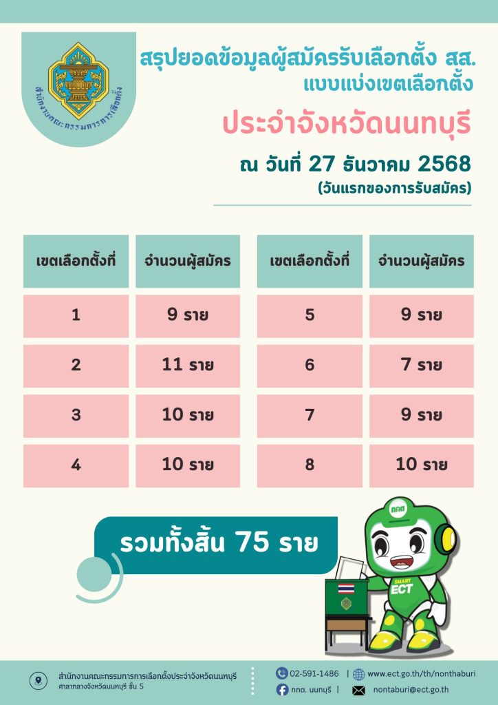 วันนี้ (27 ธ.ค.68) เวลา 08.30 น. ณ ห้องประชุม ชั้น 4 อาคารศูนย์โอทอป องค์การบริหารส่วนจังหวัดนนทบุรี อำเภอปากเกร็ด นายอภิชัย อร่ามศรี รองผู้ว่าราชการจังหวัดนนทบุรี พร้อมด้วยเจ้าหน้าที่สำนักงานคณะกรรมการการเลือกตั้งประจำจังหวัดนนทบุรี เจ้าหน้าที่ที่เกี่ยวข้อง และสื่อมวลชน ร่วมสังเกตการณ์การเปิดรับสมัครสมาชิกสภาผู้แทนราษฎรแบบแบ่งเขตเลือกตั้ง จังหวัดนนทบุรี ซึ่งมีจำนวนทั้งสิ้น 8 เขต