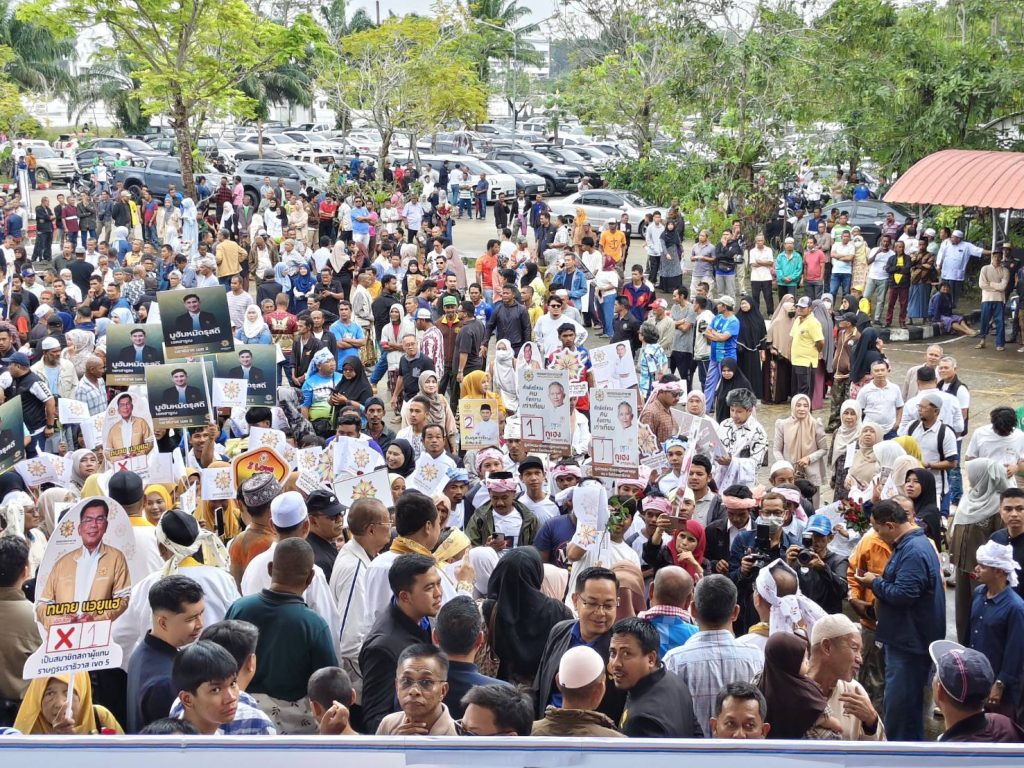 ซึ่งมีเพียงพรรคเดียวที่หัวหน้าพรรคเดินทางมาเคียงข้างผู้สมัครของตนเอง นั่นคือ “พรรคประชาชาติ” เพื่อเป็นกำลังใจให้ตัวจริงทั้ง 5 เขตเลือกตั้ง ได้หมายเลขสวยเอาฤกษ์เอาชัย นอกจาก “แบวี” พ.ต.อ.ทวี แล้ว ยังมี “บ้านใหญ่บางนรา” กูเซ็ง ยาวอหะซัน นายก อบจ.นราธิวาส รวมทั้งอดีตกำนันดัง ธนาธิป พรหมชื่น “บ้านใหญ่สุไหงปาดี” ที่ยืนขนาบข้าง ท่ามกลางกองเชียร์ที่ชูป้ายหาเสียง ถือพวงมาลัยและดอกไม้ พร้อมส่งเสียงเชียร์ผู้สมัครเป็นภาษายาวี ดังกึกก้องไปทั่วศาลากลาง ข่มขวัญกองเชียร์ต่างพรรคที่ยืนส่งเสียงเชียร์ผู้สมัครอยู่ใกล้กัน ภายนอกหอประชุมกว่าหมื่นคน ส่งผลให้บรรยากาศเต็มไปด้วยความท้าทายในสนามการเมืองระดับชาติ “เลือกตั้ง’69” ในพื้นที่ จ.นราธิวาส ส่อเค้าดุเดือดตั้งแต่ยังไม่เคาะระฆัง