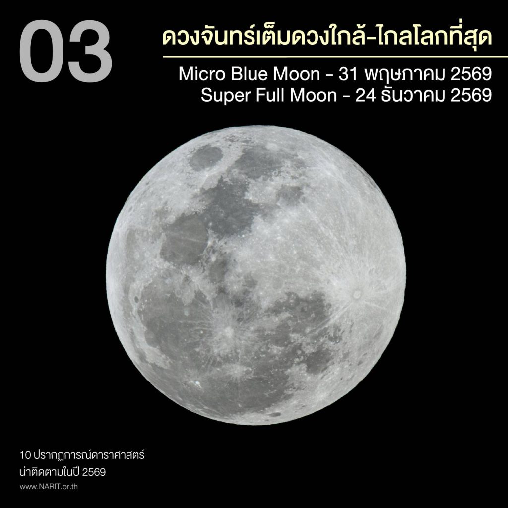 - ดวงจันทร์เต็มดวงใกล้-ไกลโลกที่สุดในรอบปี ปรากฏการณ์ “ดวงจันทร์เต็มดวงไกลโลกที่สุดในรอบปี” (Micro Full Moon) จะตรงกับวันที่ 31 พฤษภาคม 2569 ซึ่งตรงกับวันวิสาขบูชา นอกจากนี้ยังเป็นดวงจันทร์เต็มดวงครั้งที่สองของเดือน หรือ บลูมูน (Blue Moon) เกิดขึ้นไม่บ่อยนัก เรียกว่า “ไมโครบลูมูน (Micro Blue Moon)” ดวงจันทร์เต็มดวงจะมีขนาดปรากฏเล็กว่าปกติเล็กน้อย สำหรับปรากฏการณ์ดวงจันทร์เต็มดวงใกล้โลกที่สุดในรอบปี (Super Full Moon) จะตรงกับวันที่ 24 ธันวาคม 2569 ซึ่งตรงกับวันคริสต์มาสอีฟพอดี ดวงจันทร์เต็มดวงจะมีขนาดปรากฏใหญ่กว่าปกติเล็กน้อย